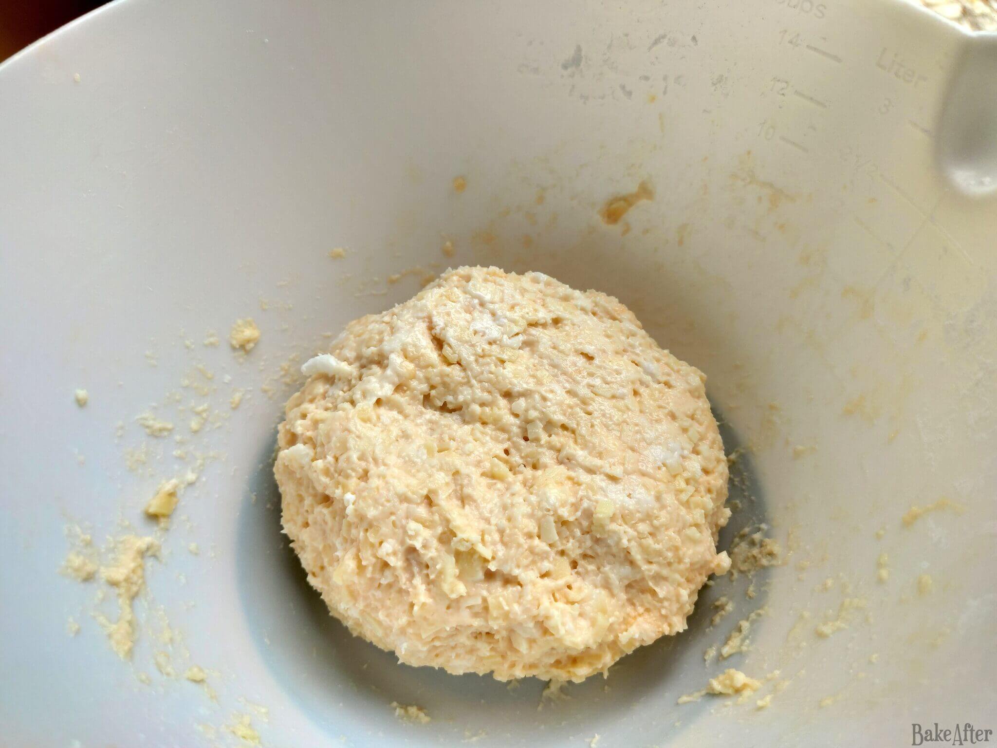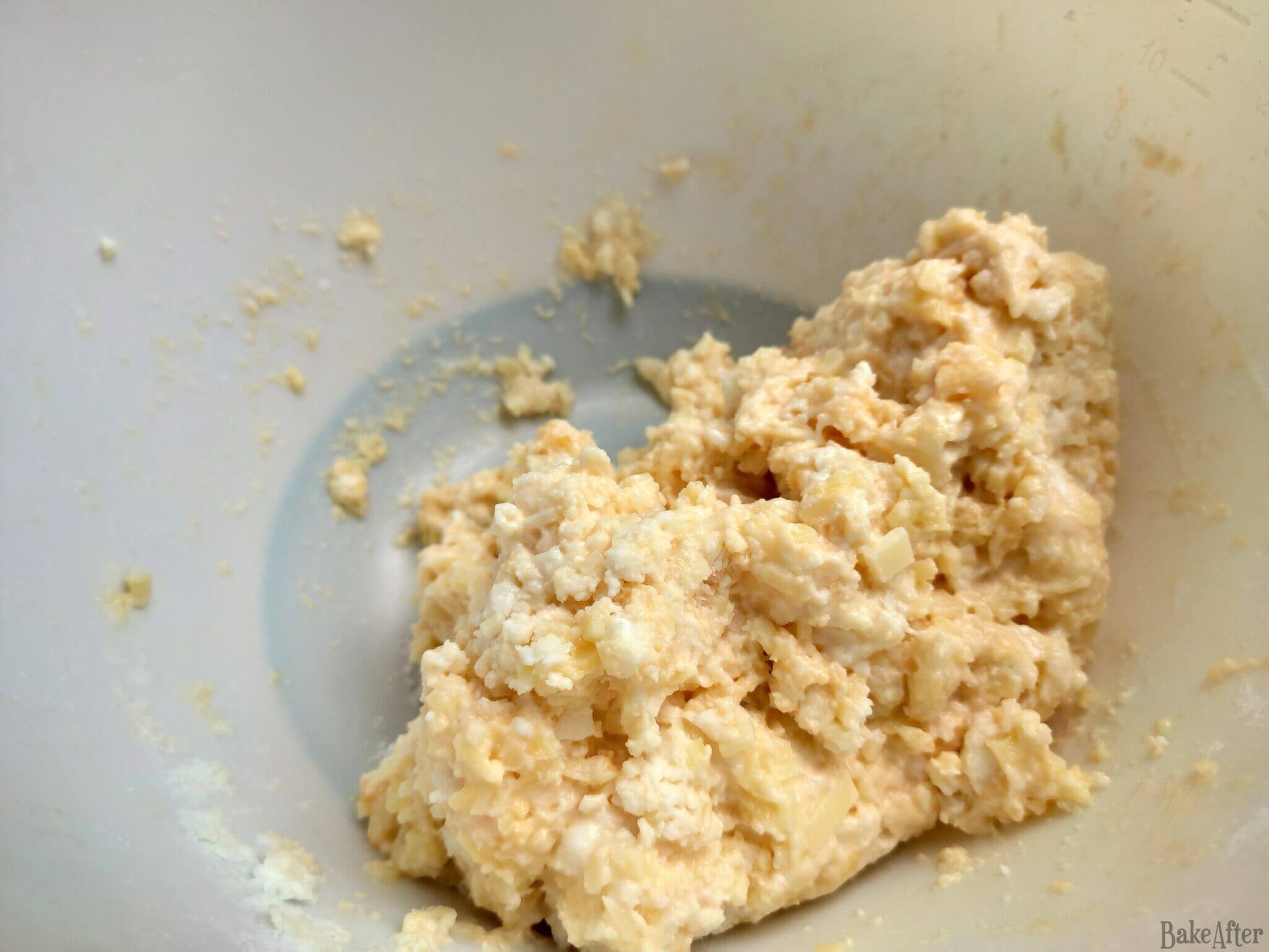 - Add the grated cheese, eggs, and a pinch of salt, and knead well.