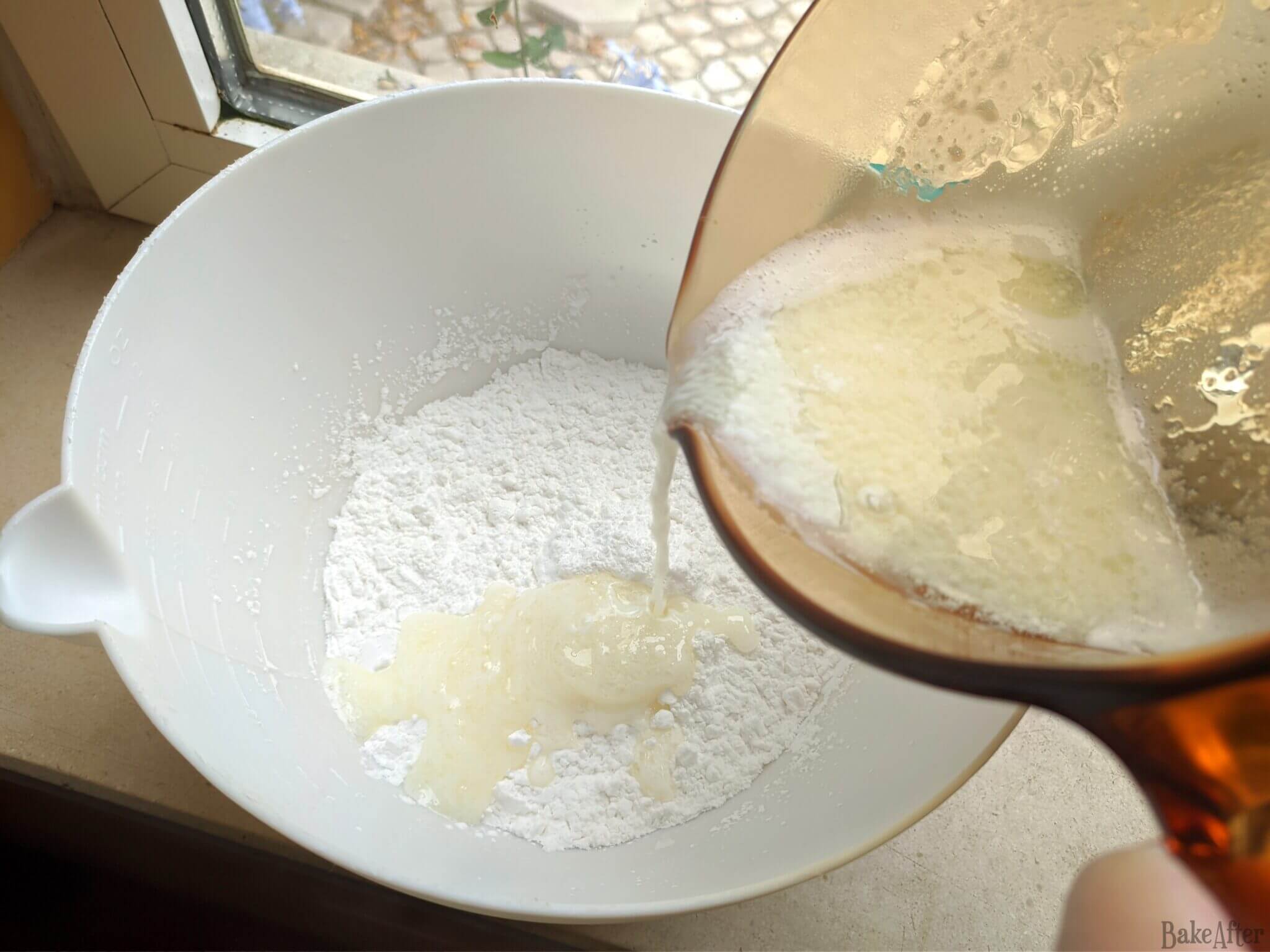 - Pour this into a bowl with the sweet tapioca starch, mix, and let cool.