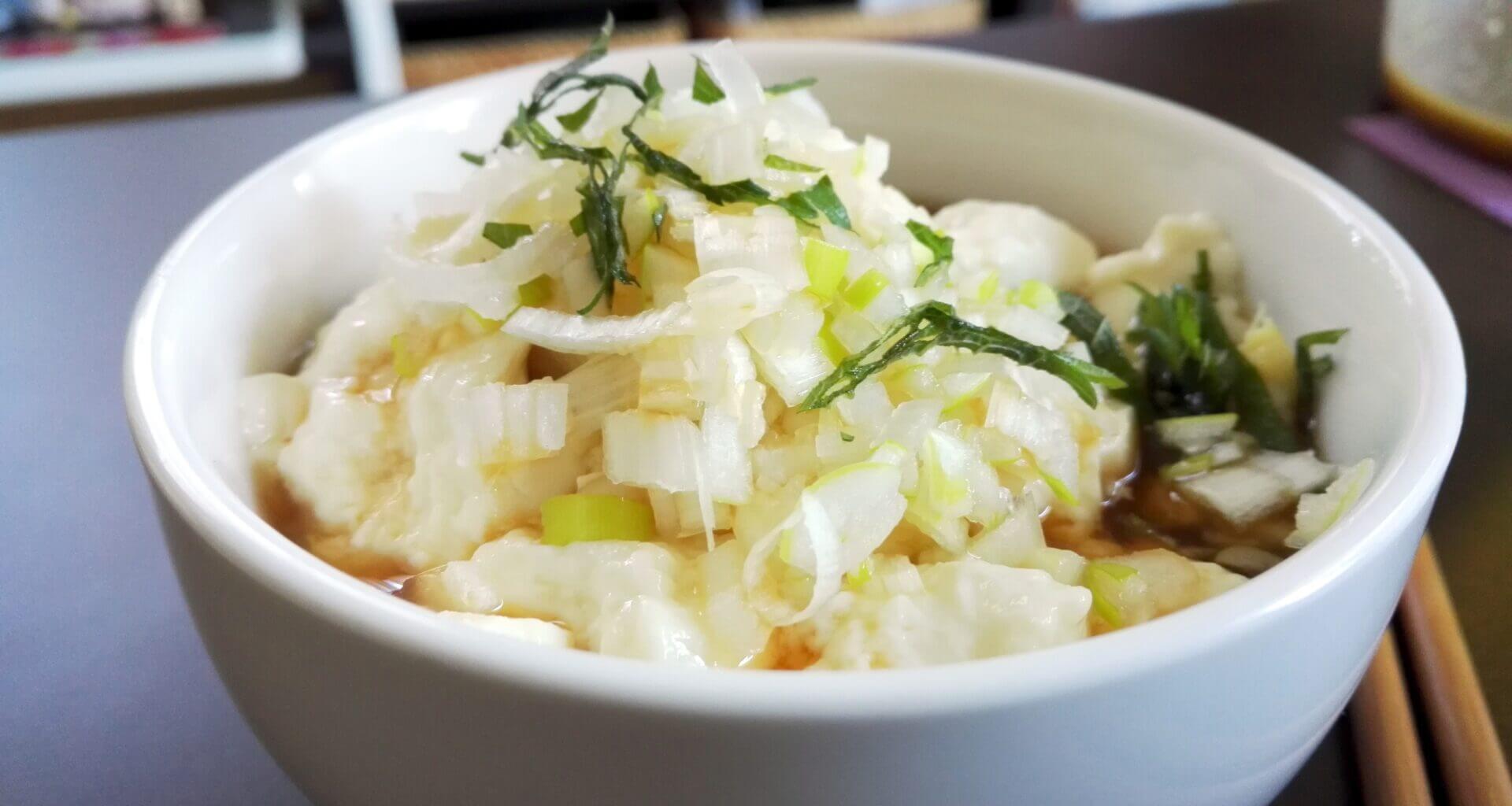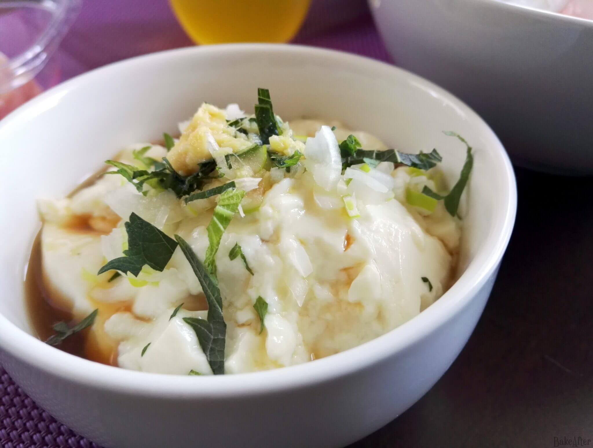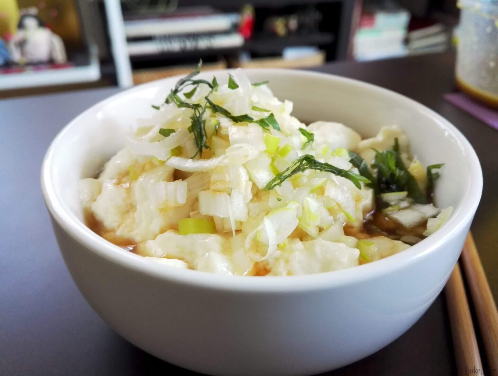 The dish itself is basically fresh tofu or silken tofu topped with chopped scallions, grated ginger, and a bit of soy sauce… that’s it! Tofu doesn’t really taste like much on its own, so it’s all about texture. If you add honey or caramel, it becomes a dessert. If you add a bit of the saltiness from soy sauce and some aromatics like in this recipe, it takes on a whole new savoury dimension, and serving it cold makes everything even more delicious.