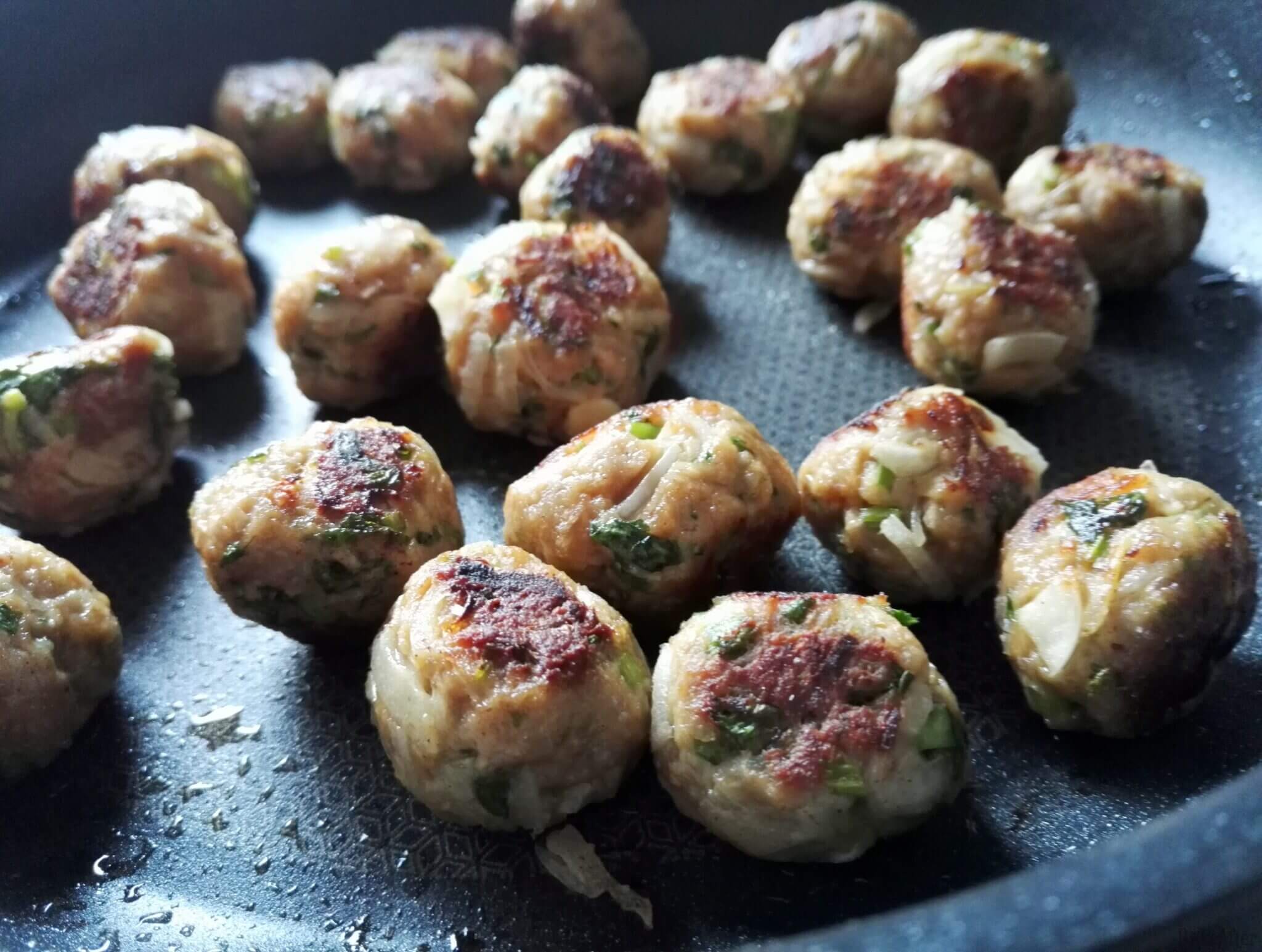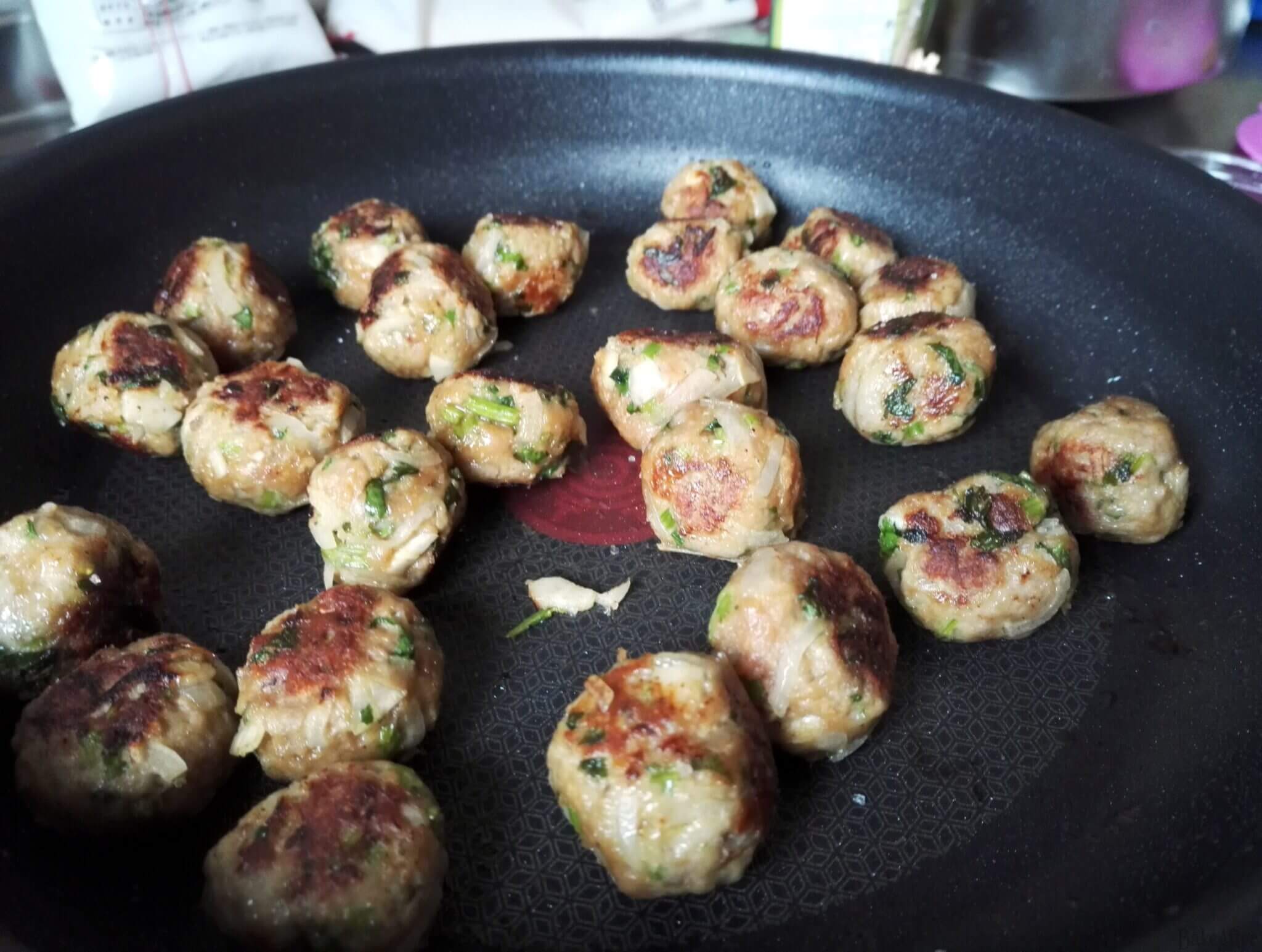 - Put the mini meatballs in the pan and fry them well on all sides until they are golden brown. When all sides are done, the inside will also be cooked (since they are pretty small).