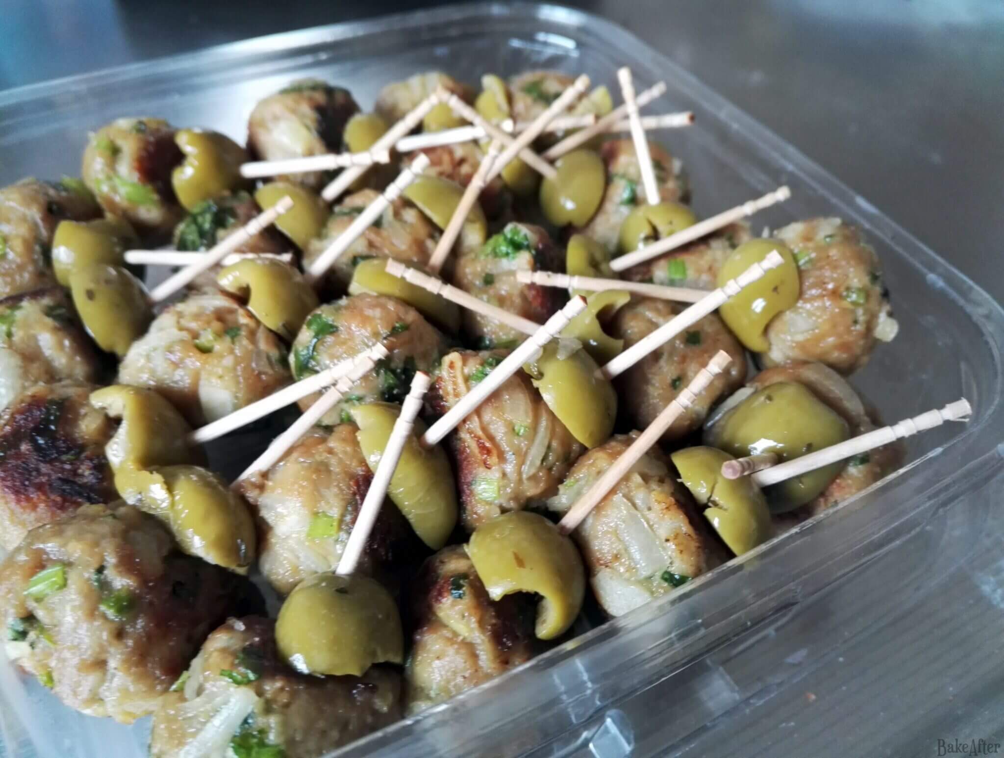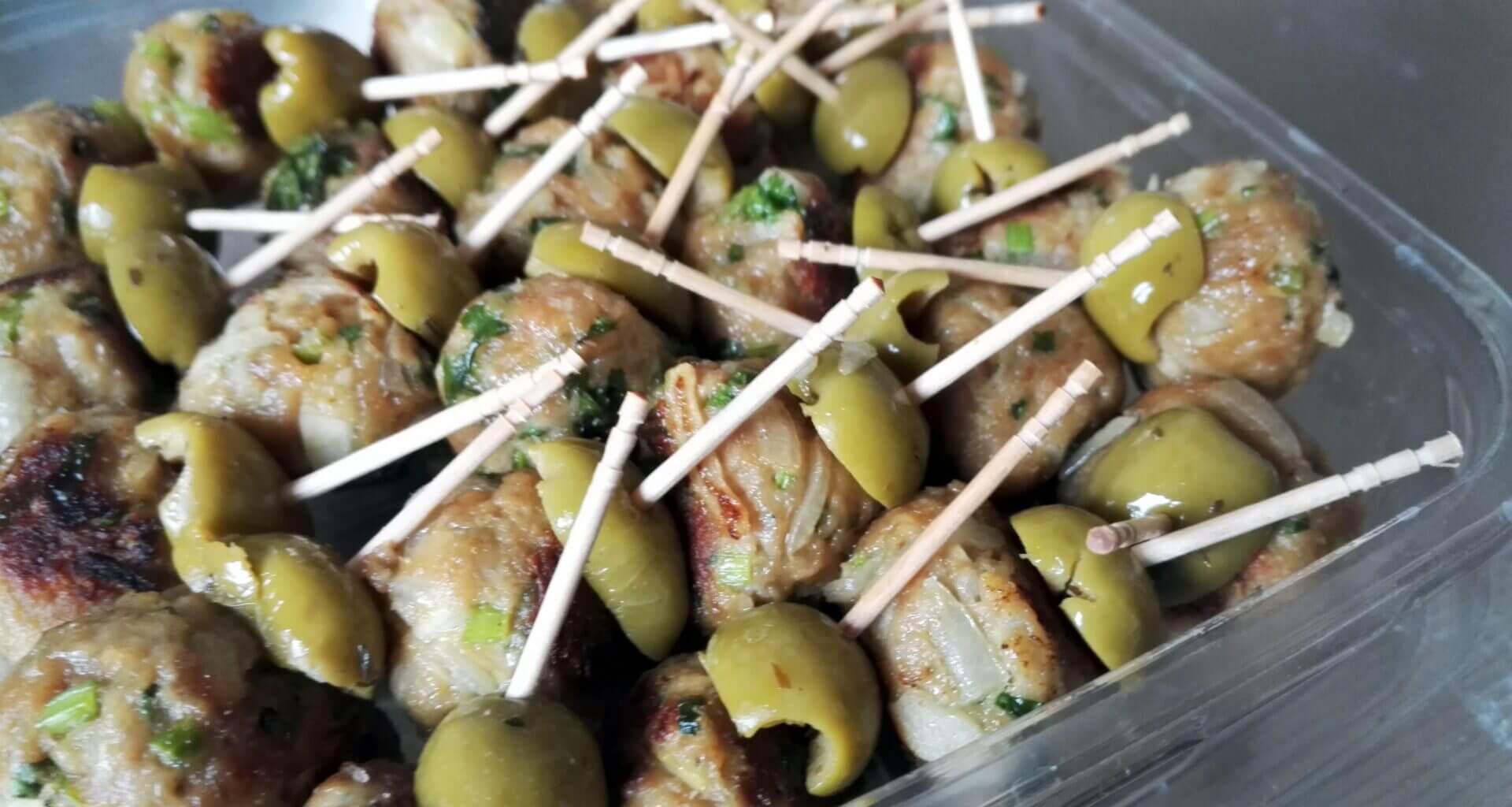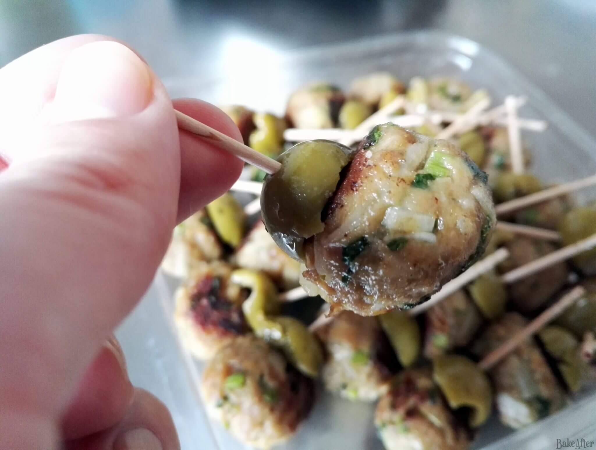 - Remove from the heat and cut the olives in half. Stick a toothpick through half an olive and a mini meatball. Taste and season with a pinch of salt and pepper if necessary. And that’s it! Bon appétit!