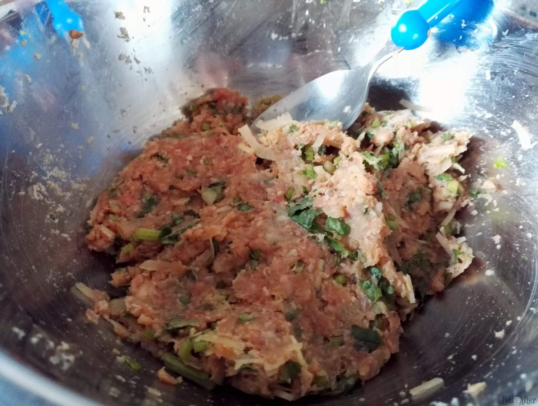 - Start by combining both meats in a bowl, followed by the chopped garlic, onion, and cilantro, and mix until you have a dough.