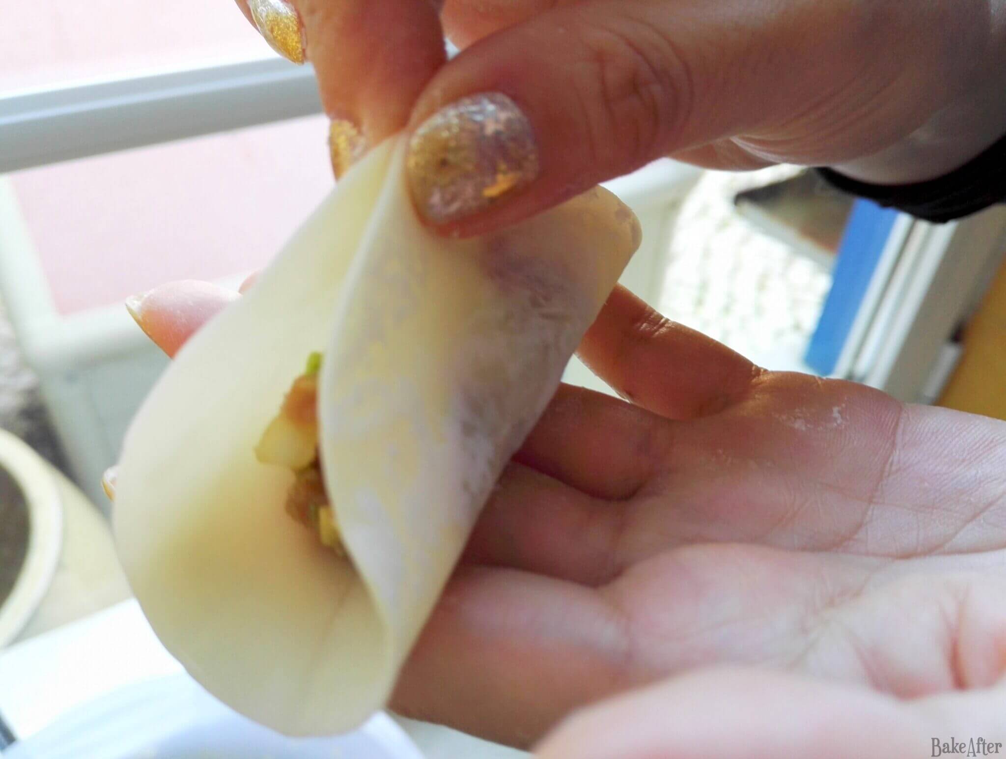 - Remove a gyoza wrapper from the package, pour some water into a small bowl, take a circle of dough in your hand, place a heaping teaspoon of filling in the center of the dough, then, with a finger moistened with the water from the bowl, run it along the edges of the dough, fold it in half and seal the ends of the dumpling with your fingers. Traditionally, each fold is made one by one and secured to achieve the traditional gyoza shape.