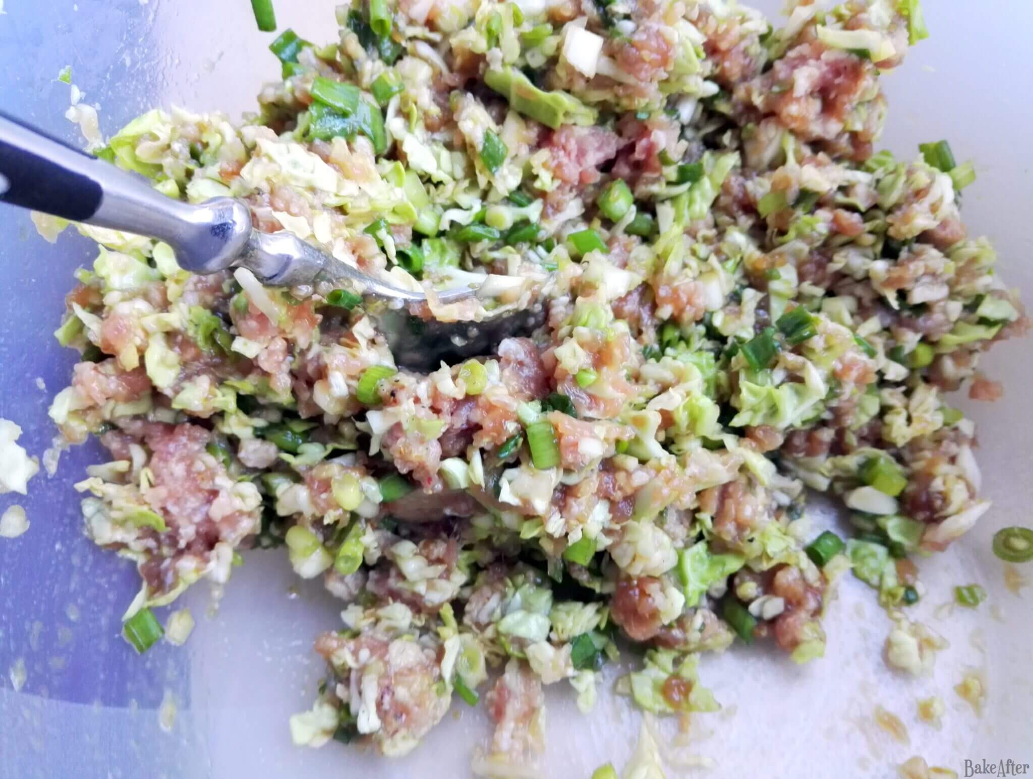 - Squeeze the cabbage well to remove excess water and add it to the bowl with the scallions. Add the ground pok meat, season everything with sake, sesame sauce, soy sauce, salt, and pepper, and mix until a consistent dough forms (consistent but a bit more loose than like a meatball dough).
