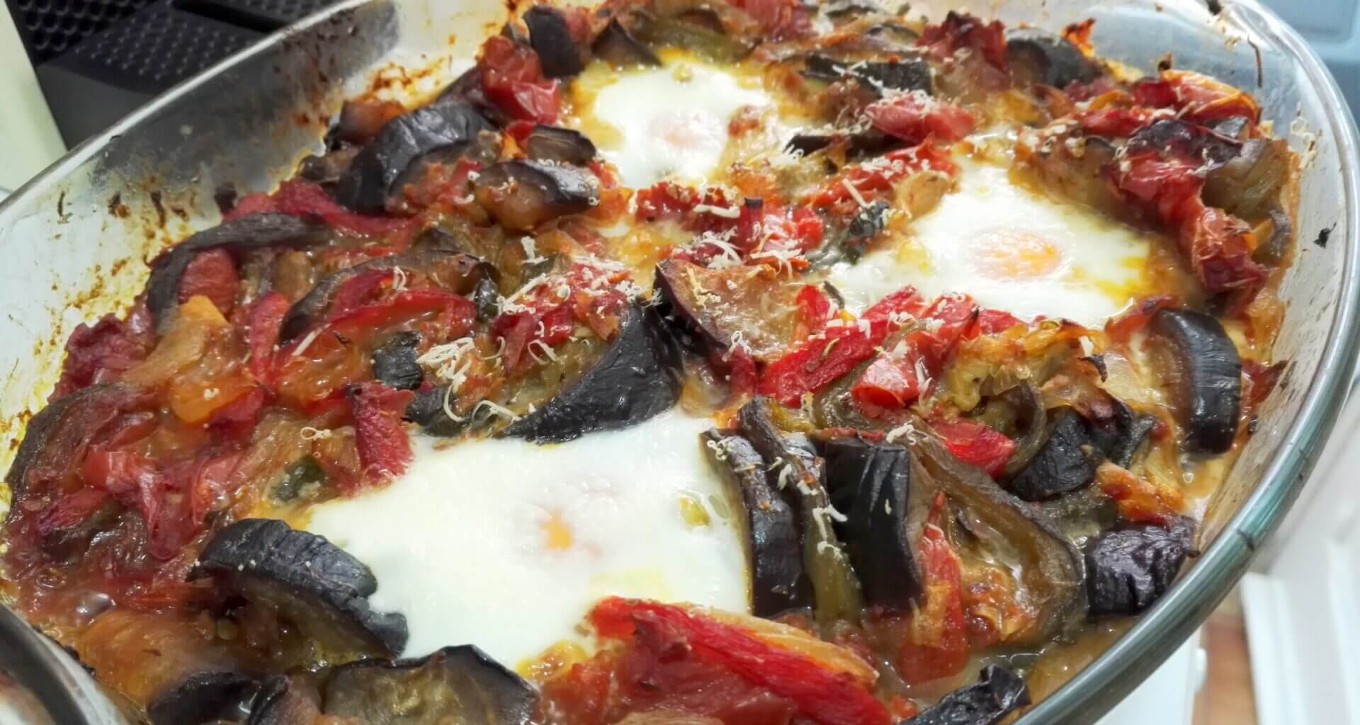 - Preheat your oven to 200°C (400°F). In a large rimmed baking dish or heavy roasting pan, combine the eggplant, onions, red peppers, tomatoes, and garlic, chop these very rustic.
