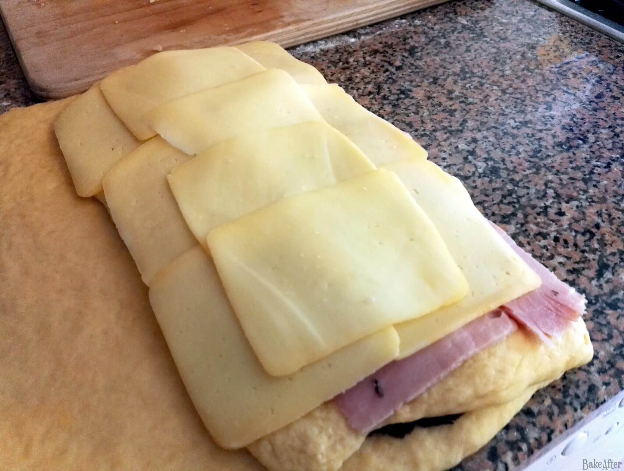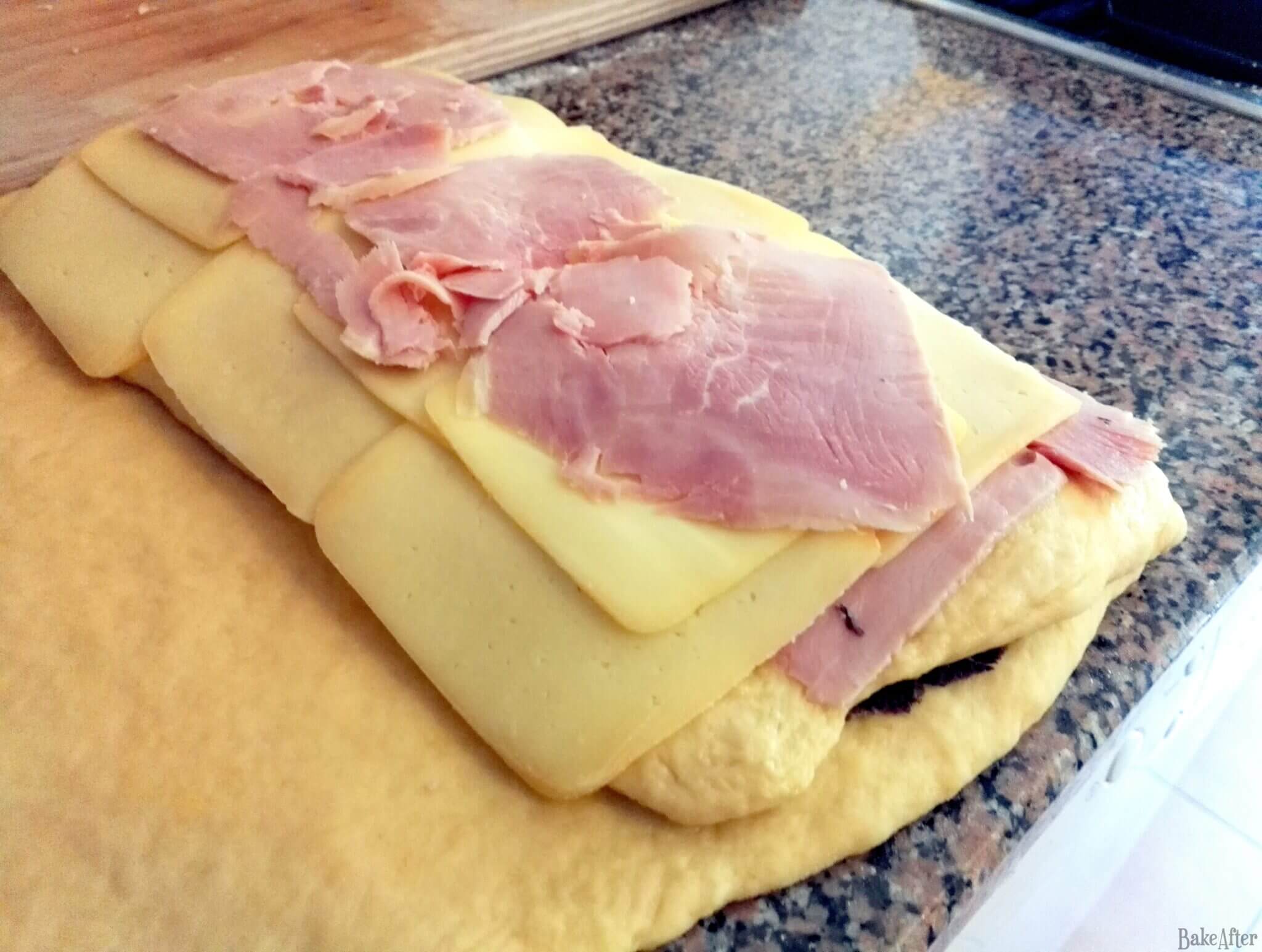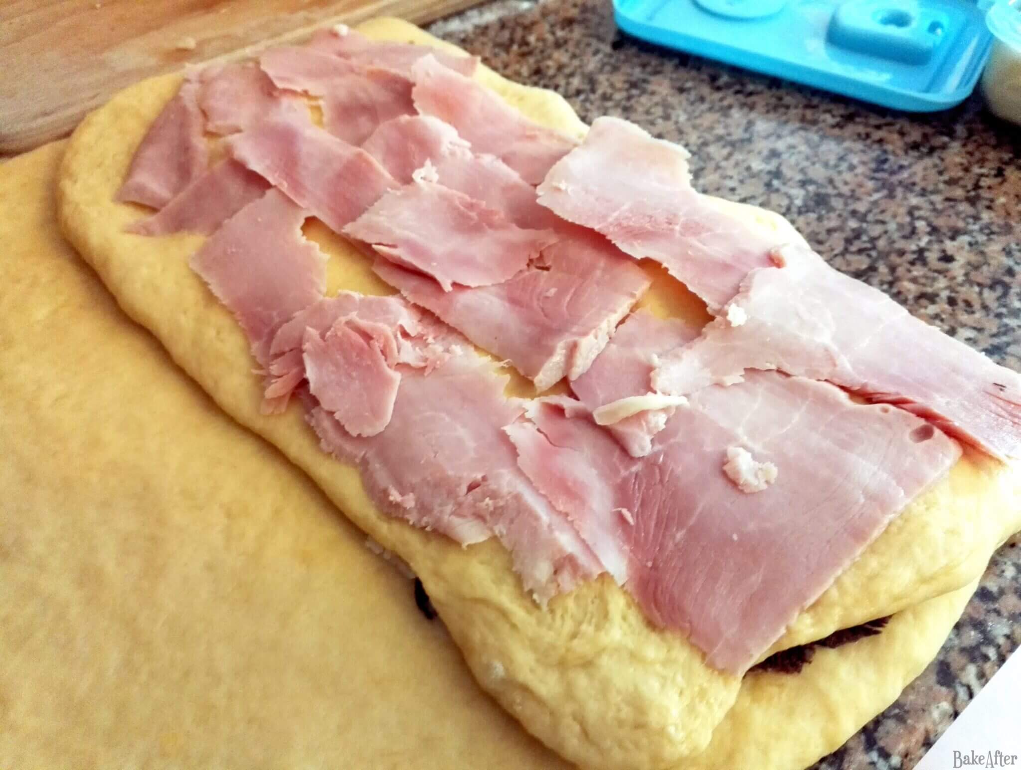 - Then fold one end over the ham to cover it. Place the remaining ham on top of this portion of dough with the remaining cheese.
