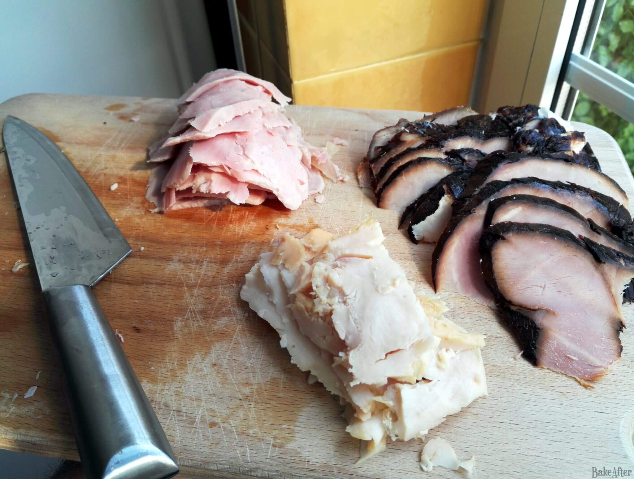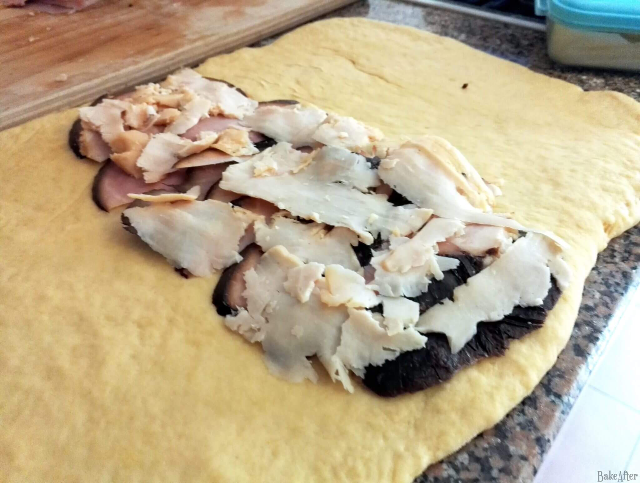 - Place 2/3 of the mixed hams sliced thinly and half the cheese in the center of the rectangle.