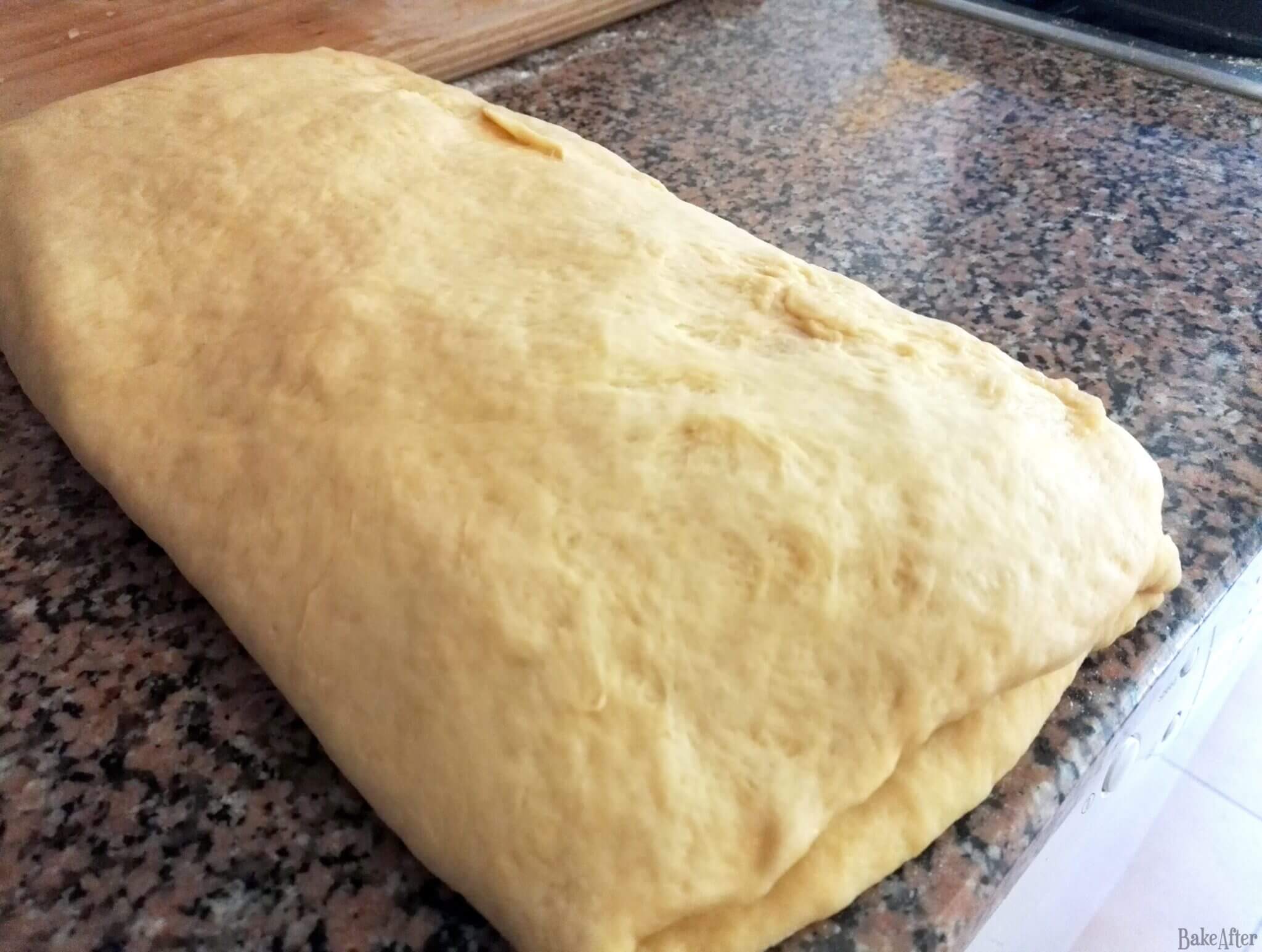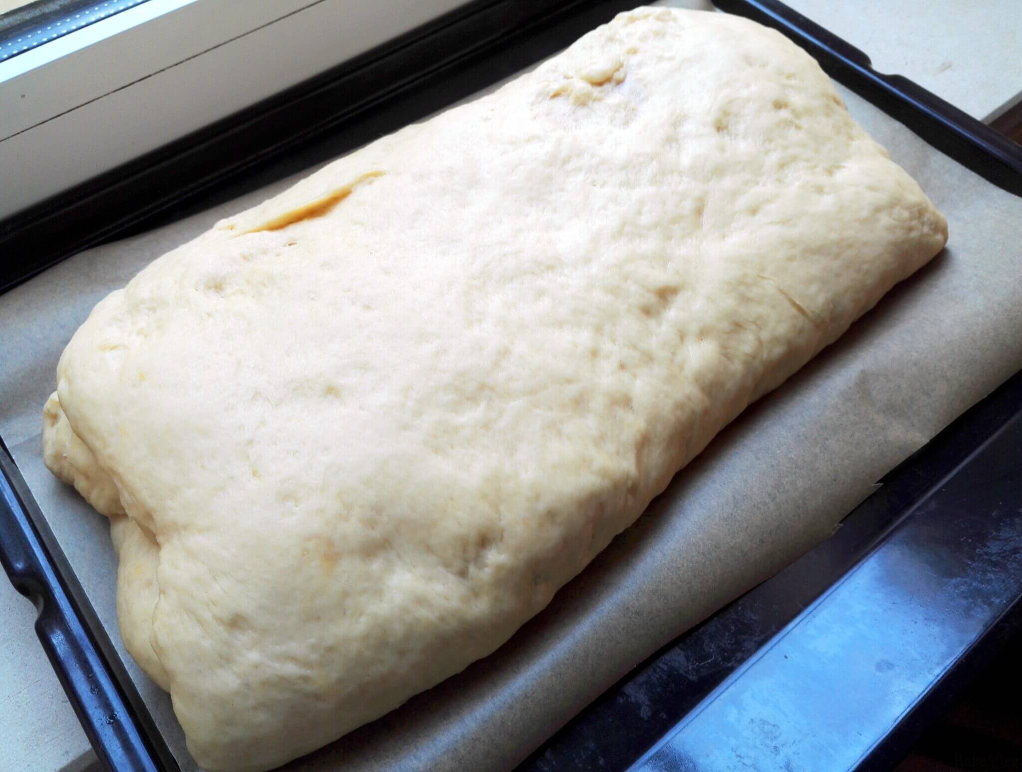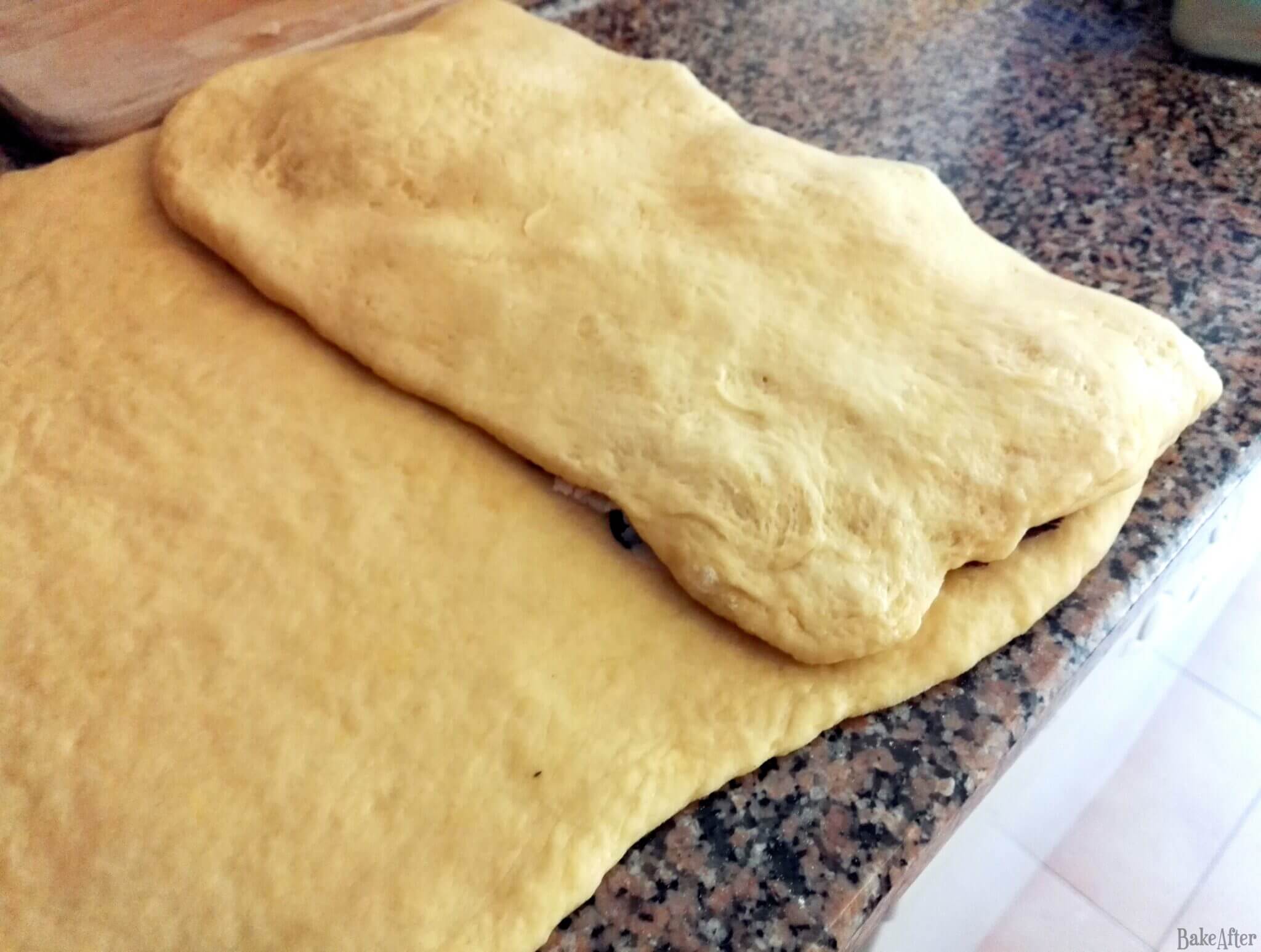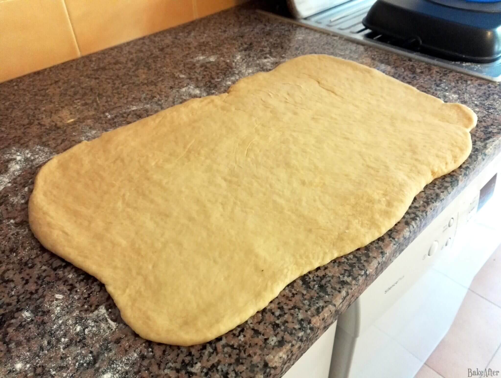 - When risen, place it back on a floured surface and knead. Then roll it out into a rectangle with a rolling pin.