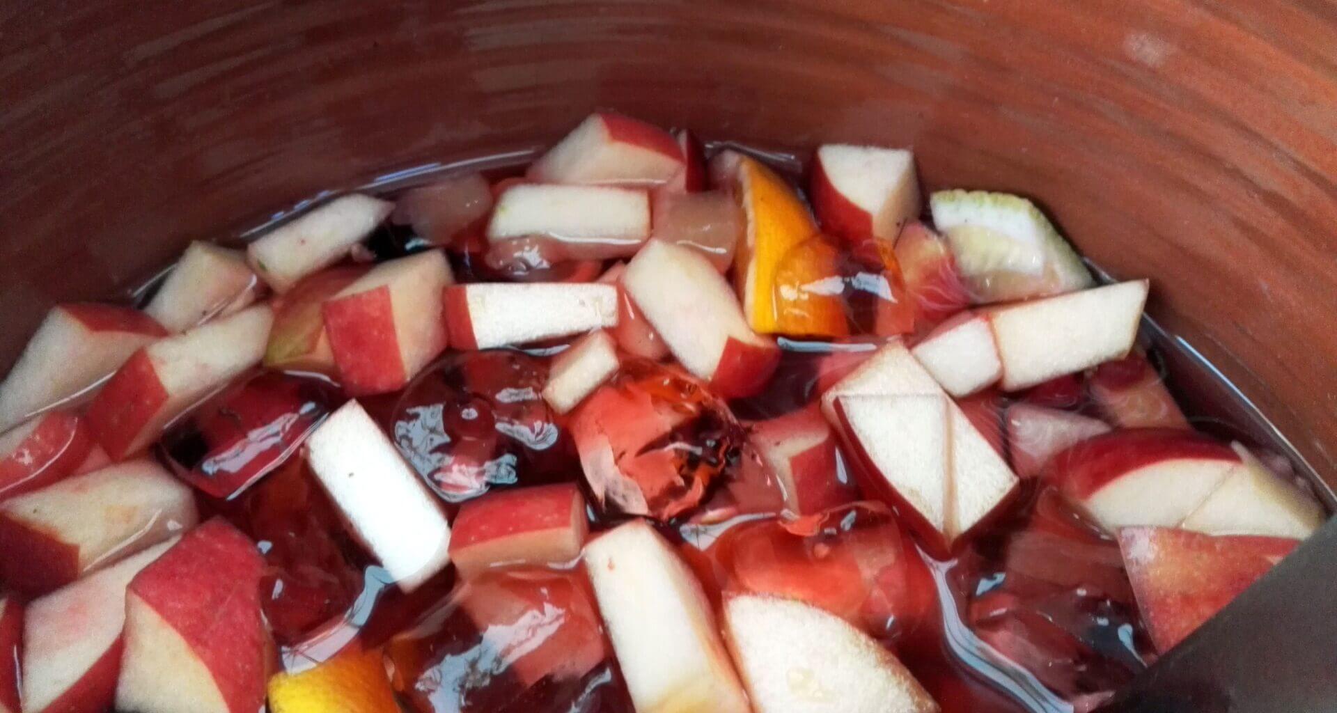 - Start by adding the berries, diced apples, diced lime and diced orange, cinnamon, followed by the sugar to a large jug and stir a little.