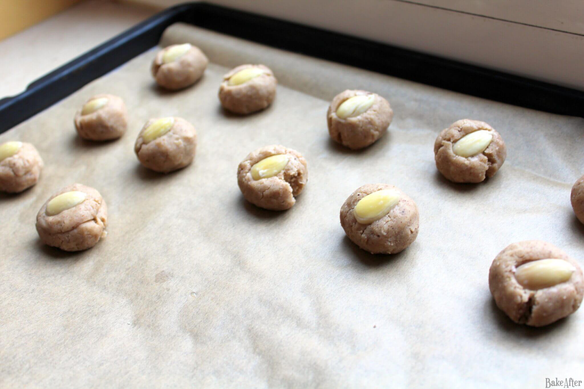 - Take pieces of dough, shape them into balls, add an almond on top, place them on the baking sheet, and bake for about 12 minutes until golden brown. That’s it! Bon appétit and Happy Saint Martin’s Day!