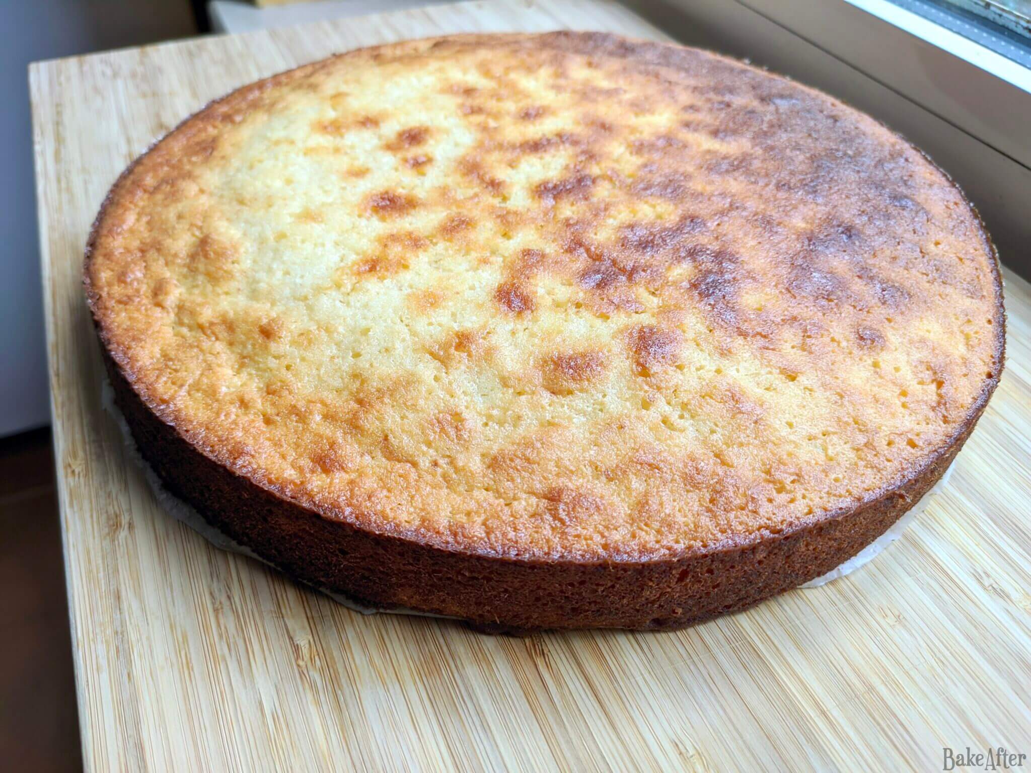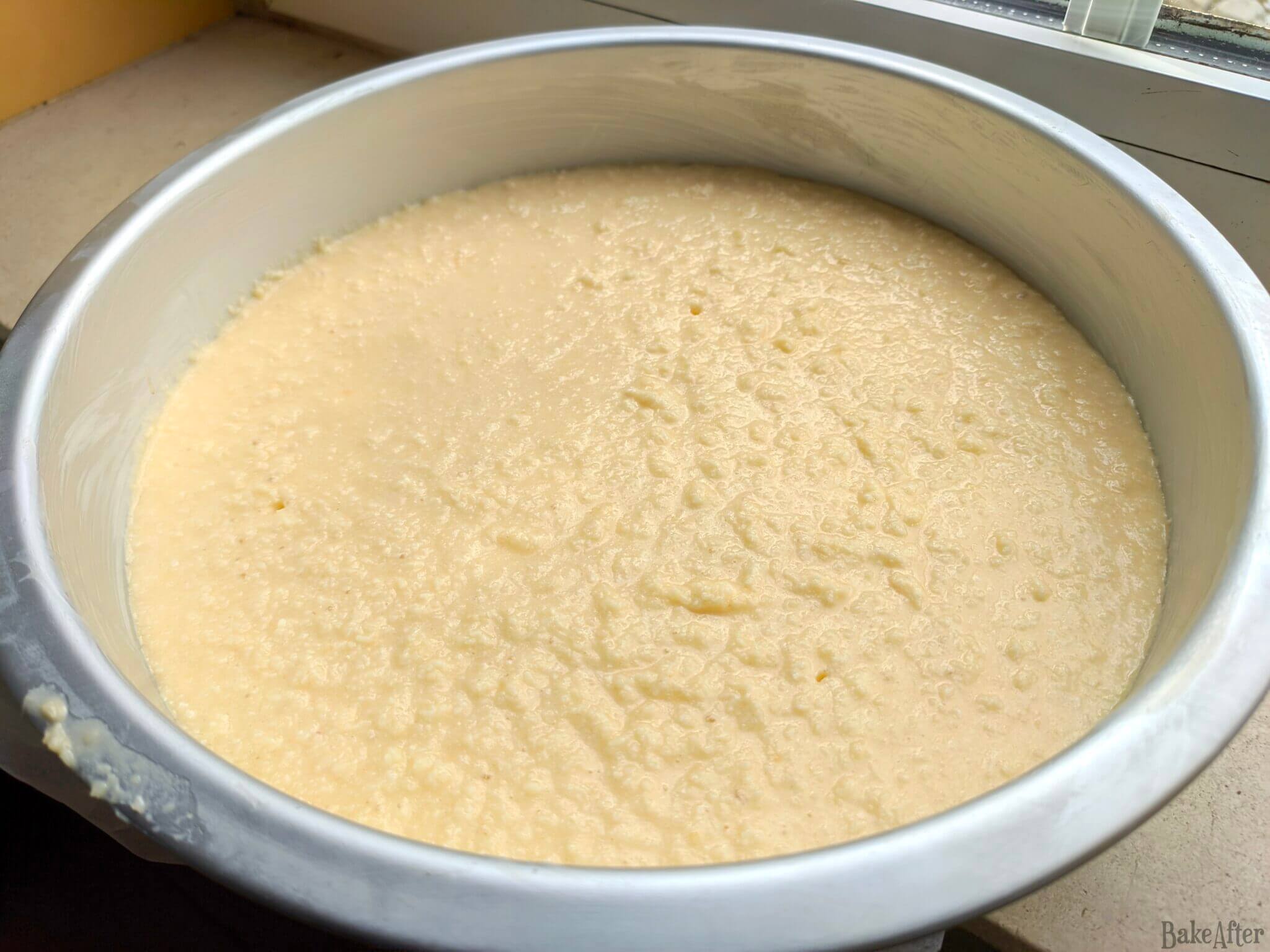 - Preheat the oven to 180ºC (350°F) and line the bottom of a round cake pan with parchment paper. Grease well with butter, pour in the batter, and bake for about 35 minutes until golden brown and cooked through (insert a toothpick into the center, if it comes out clean, the cake is ready). Remove from the oven and let cool.