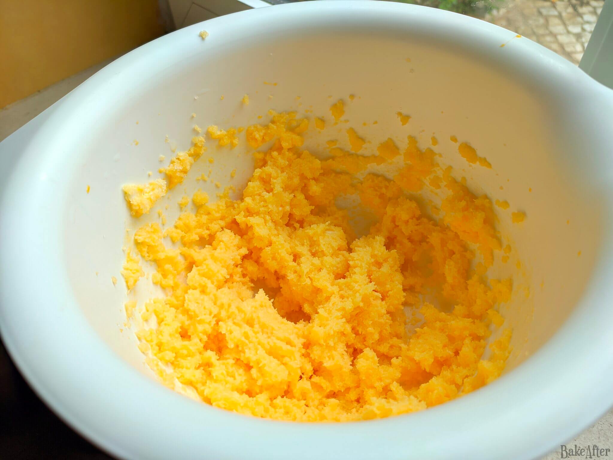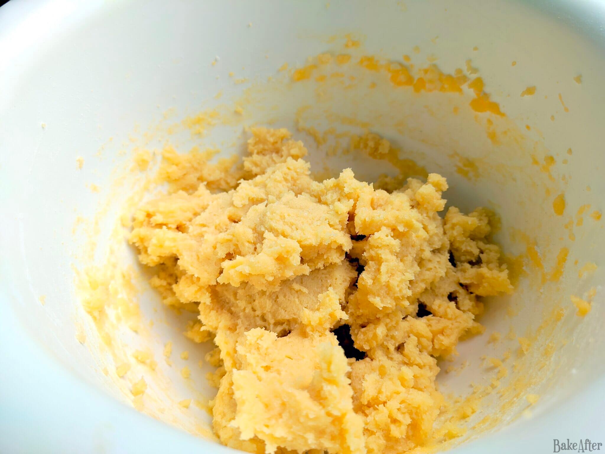 - In another bowl, combine the egg yolks, softened butter, and sugar and whisk well until creamy.