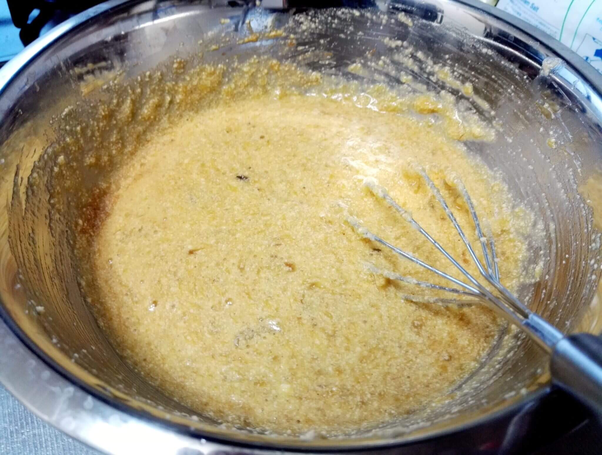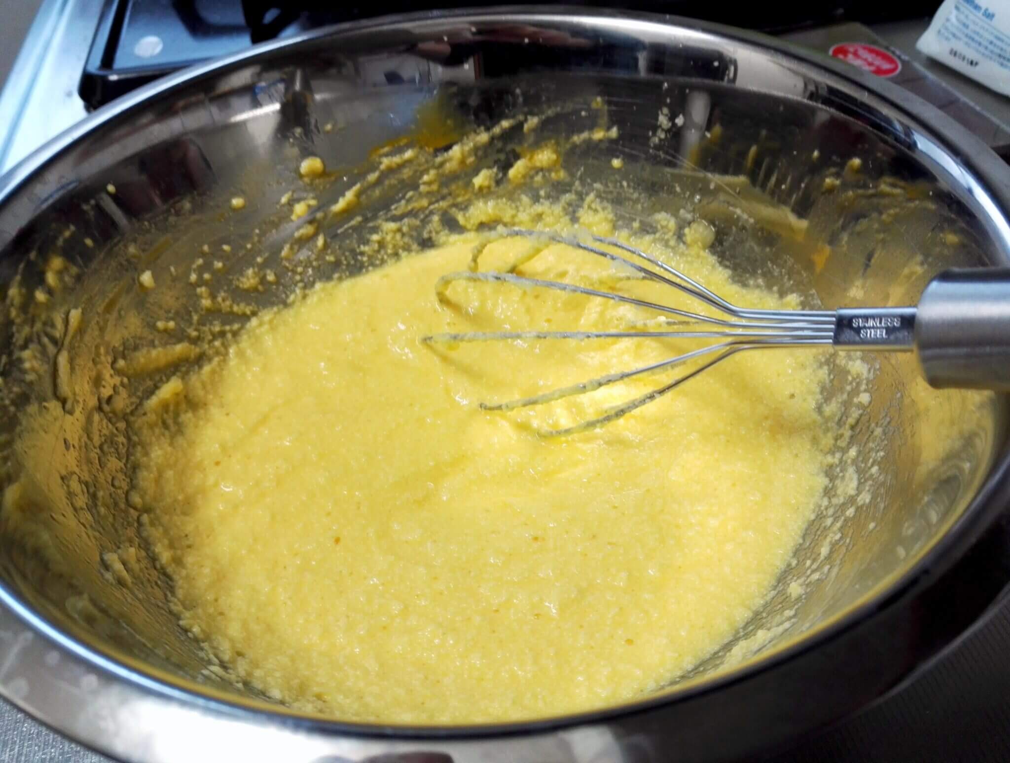 - In a bowl, combine the sugar and butter and whisk well until smooth. Add the eggs one at a time, whisking until a homogeneous batter forms.