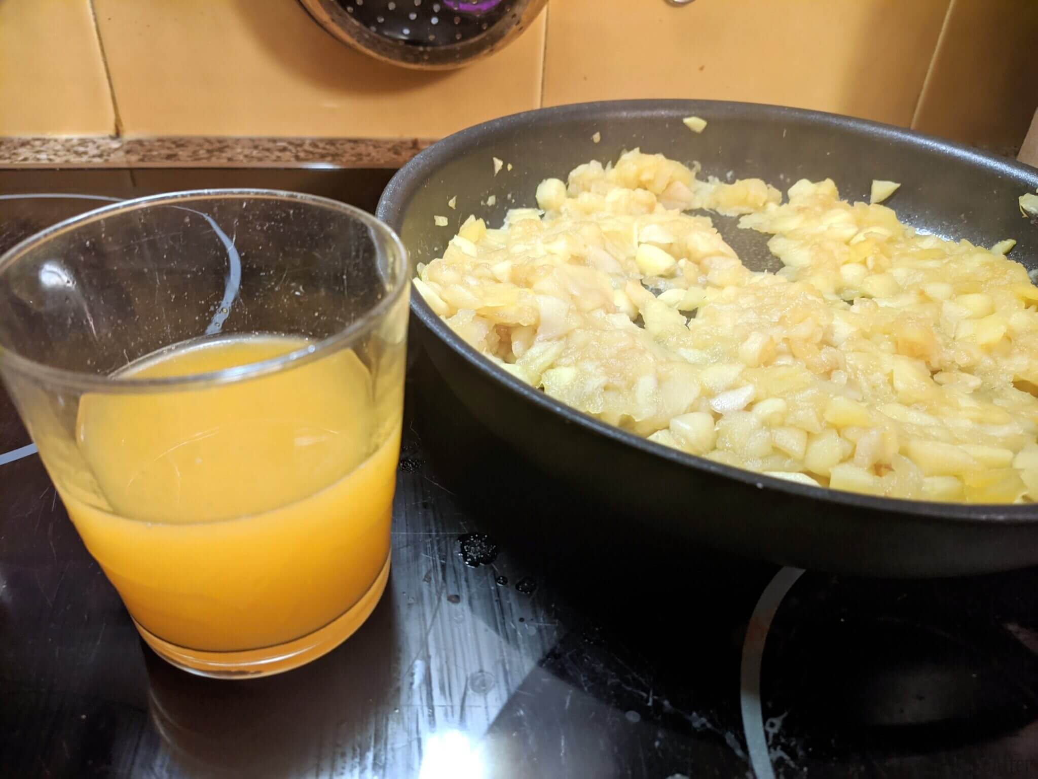 - When the apple is all cut, add it and the rest of the tangerine juice and a little sugar, mix and cook covered over medium/low heat.