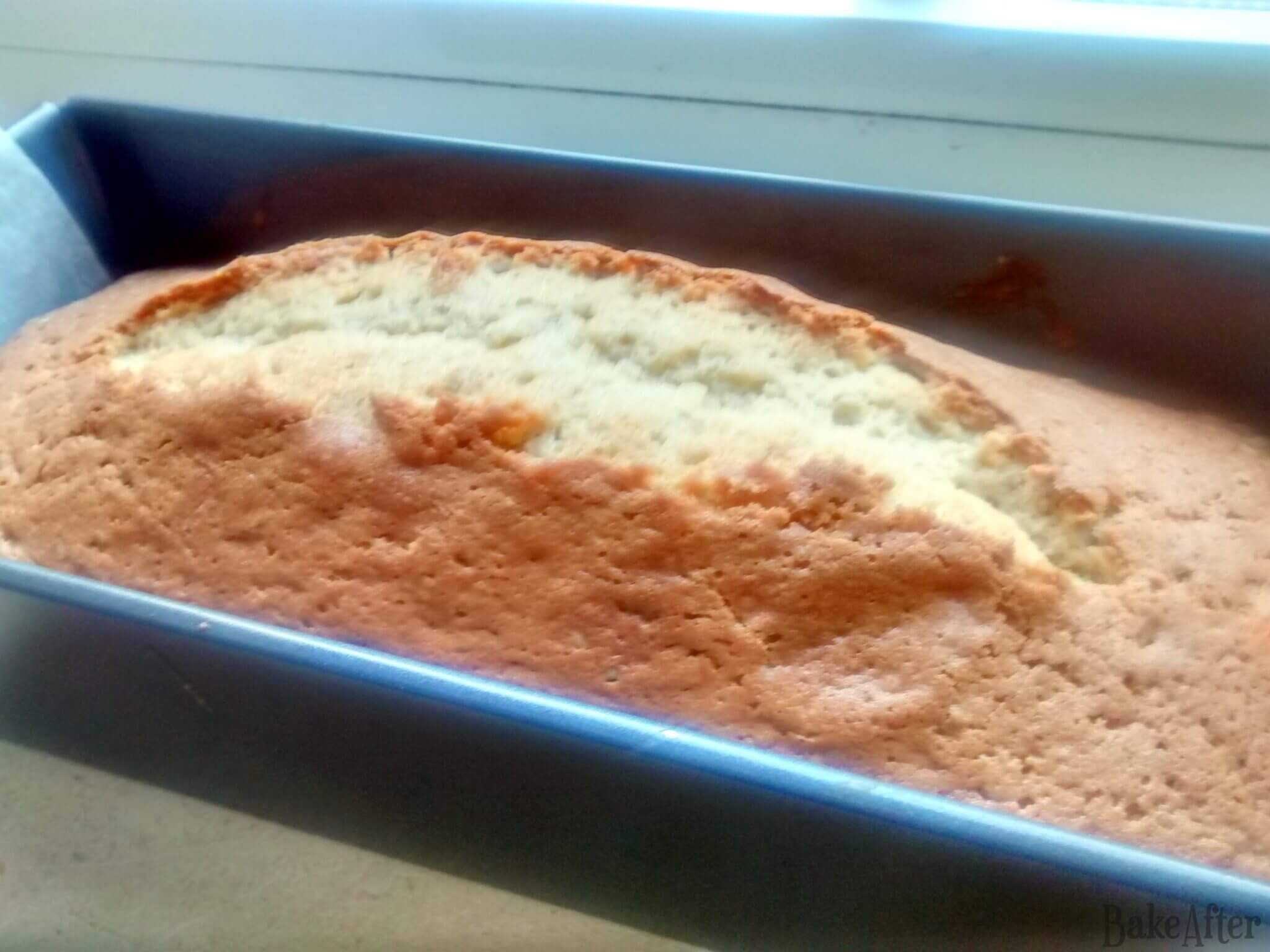 4. Pour the batter into the pan and bake for about 45 minutes until done and cooked through. Insert a toothpick into the center, if it comes out clean, the cake is ready. Remove from the oven and let it cool slightly.