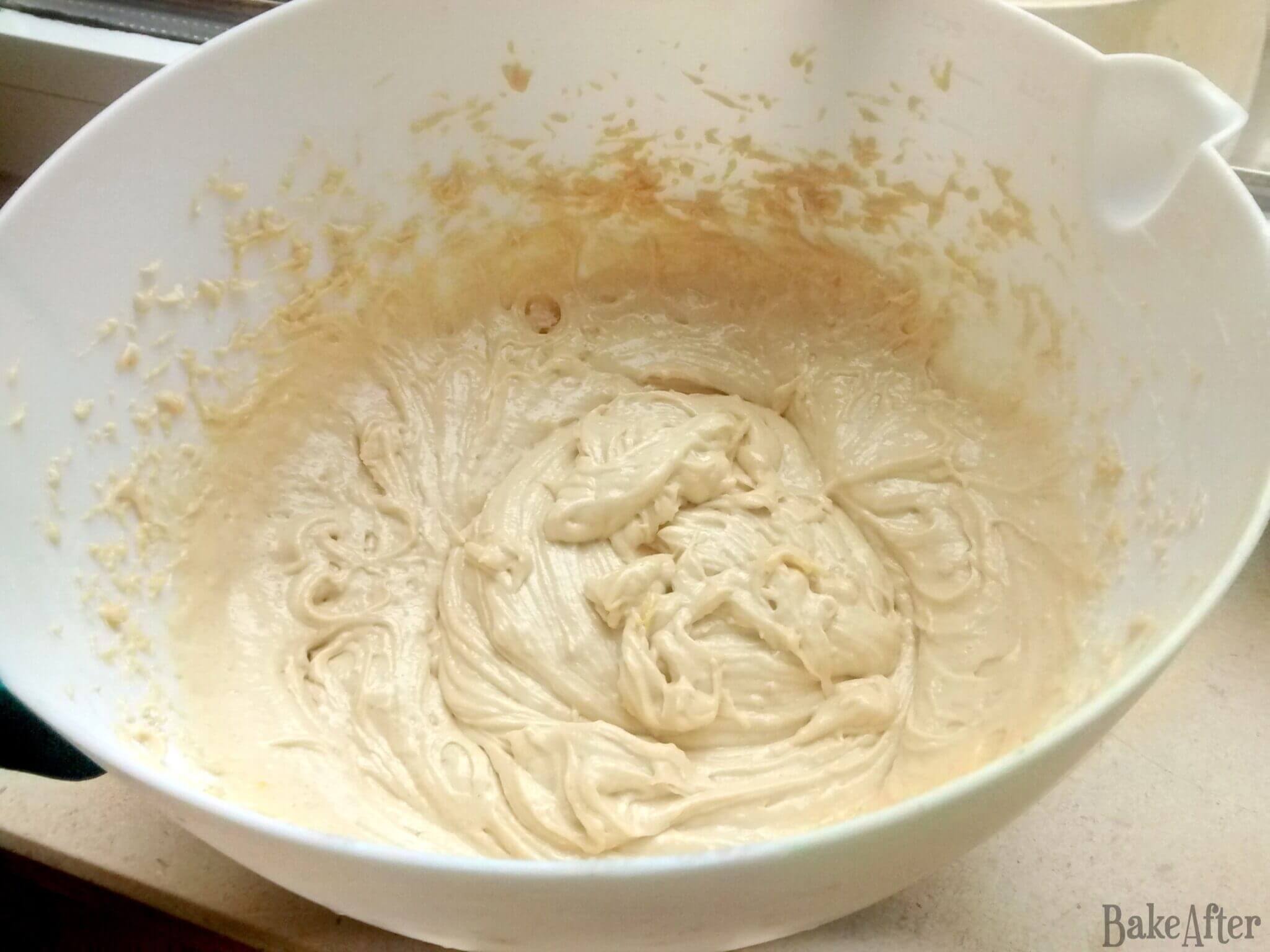 3. Combine all the cake ingredients in a bowl, the 180g of flour, the 180g of sugar, the 110g of butter, the 4 tablespoons of milk, the 2 eggs and the lemon zest, make sure the lemon zest is very fine, you want a smooth, fragrant cake, not one with chunks of peel. Whisk everything well until you have a light, fluffy mixture.