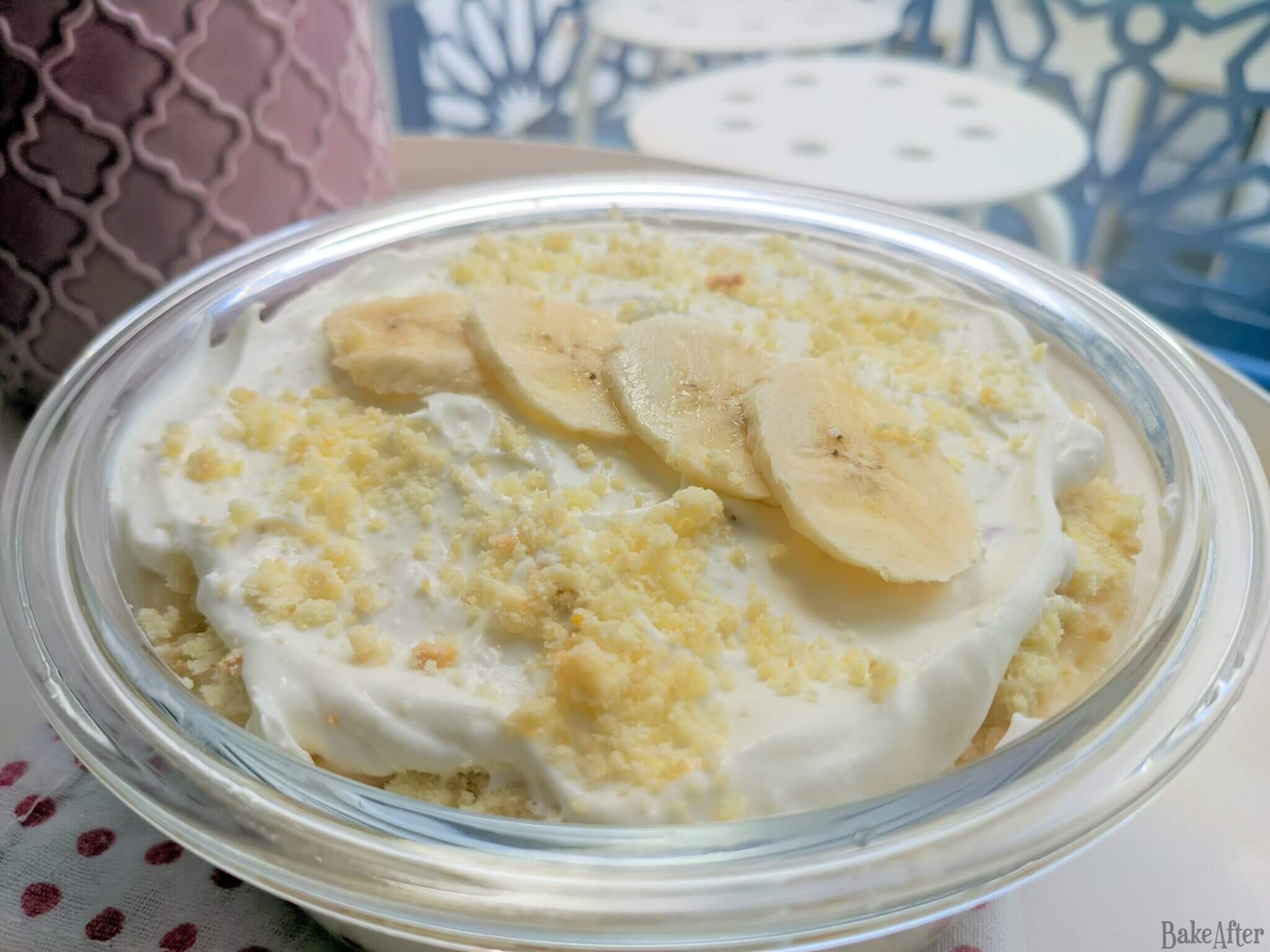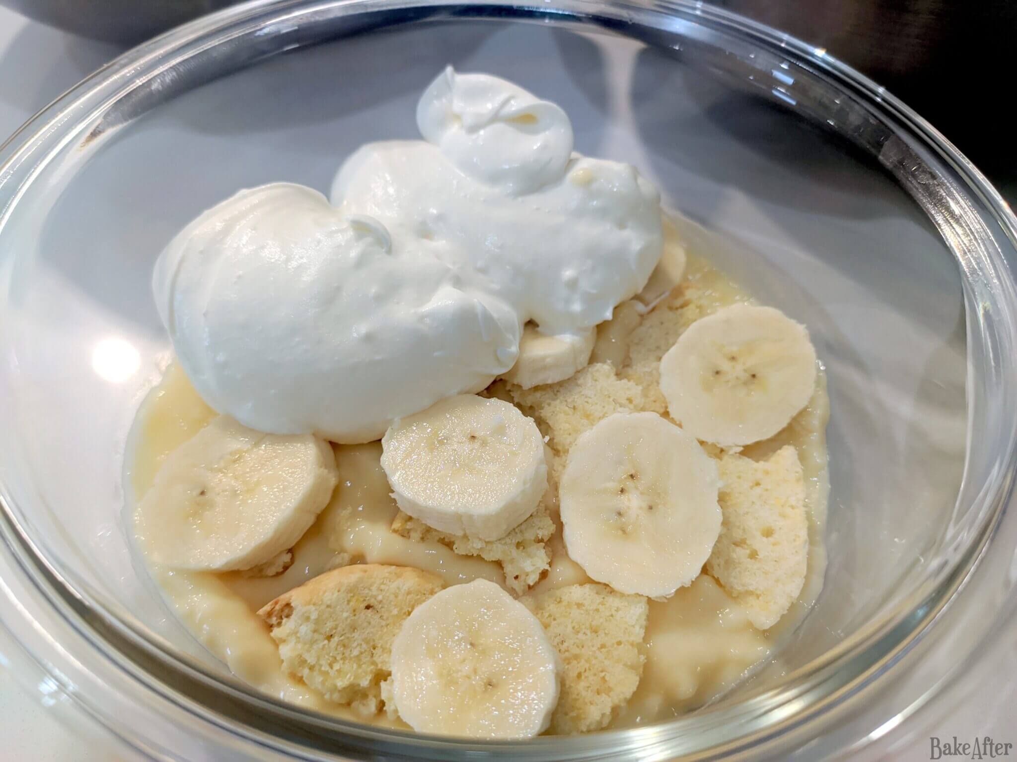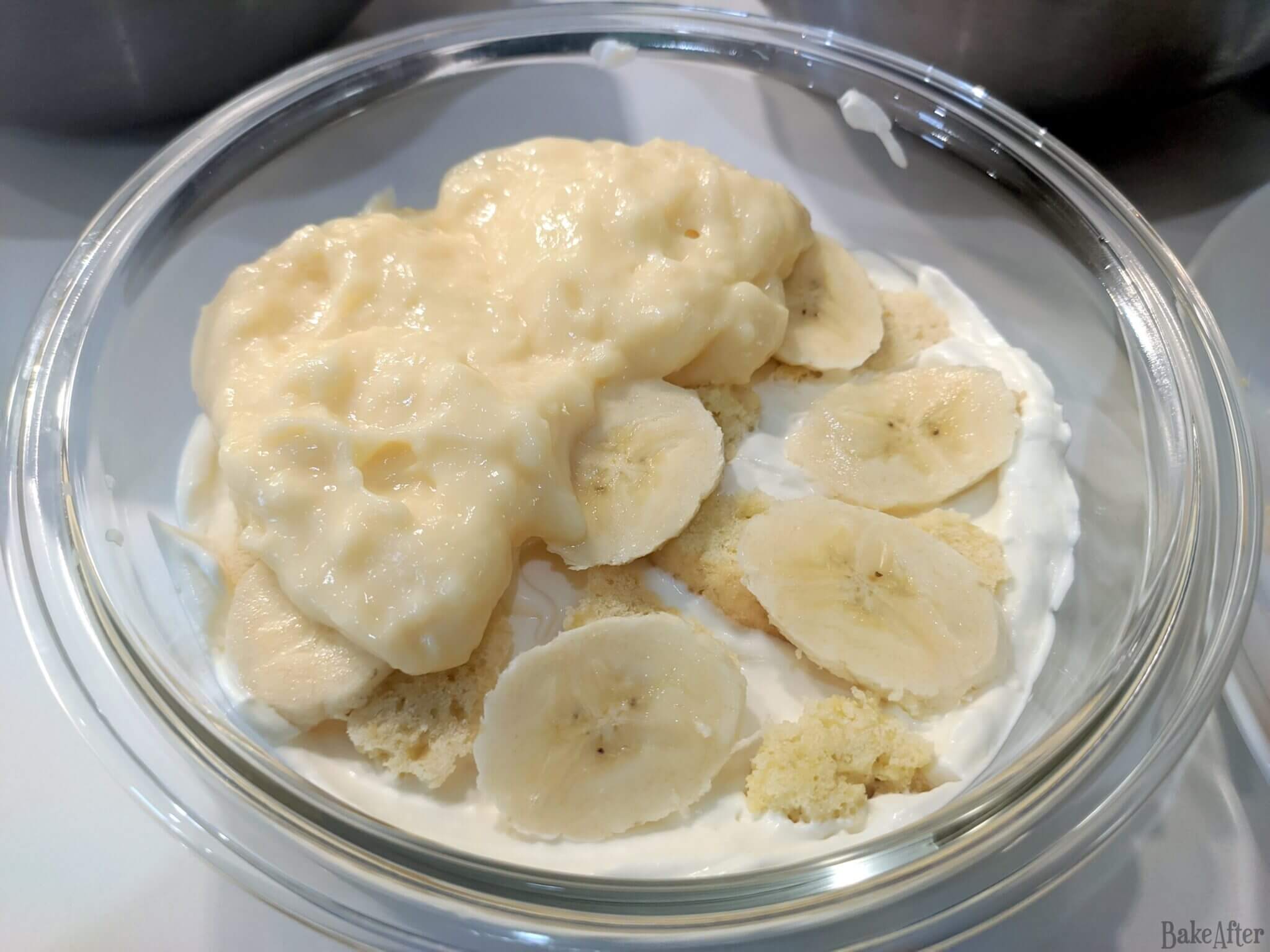 - Finally, just assemble it. I made pudding/cookie/banana/whipped cream layers until I had 3 layers. I finished the top with whipped cream, crushed cookies sprinkled on top, and a few slices of banana, and it’s ready to serve. Or you can put it back in the refrigerator. It will keep well for 1 day in the refrigerator, but any longer than that and you risk the banana starting to oxidize. Enjoy!