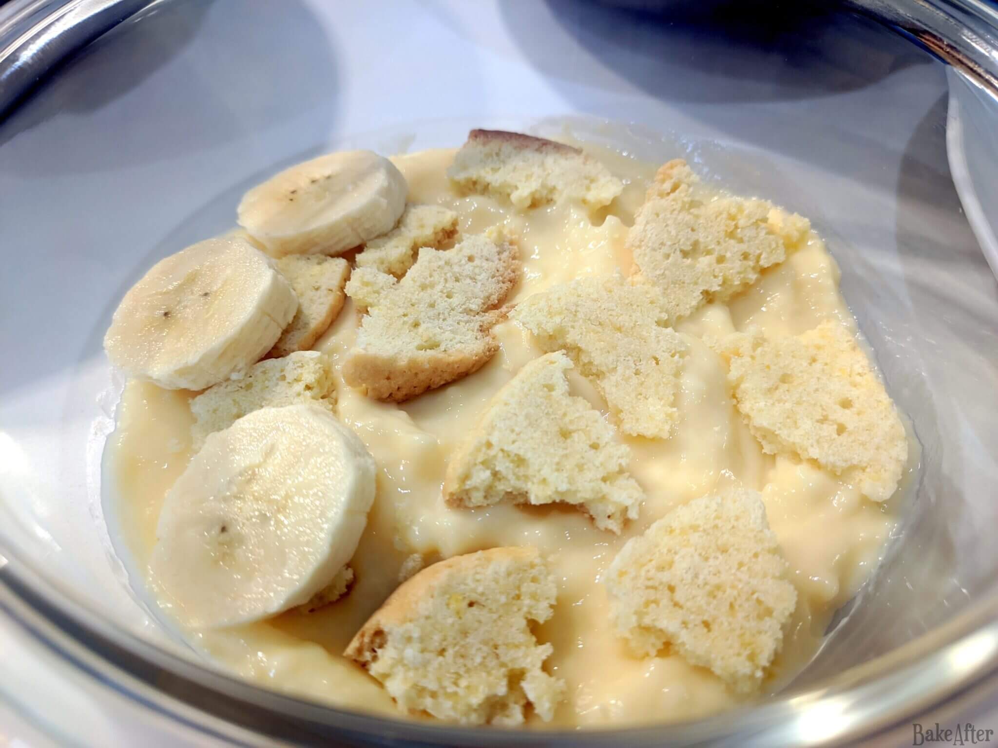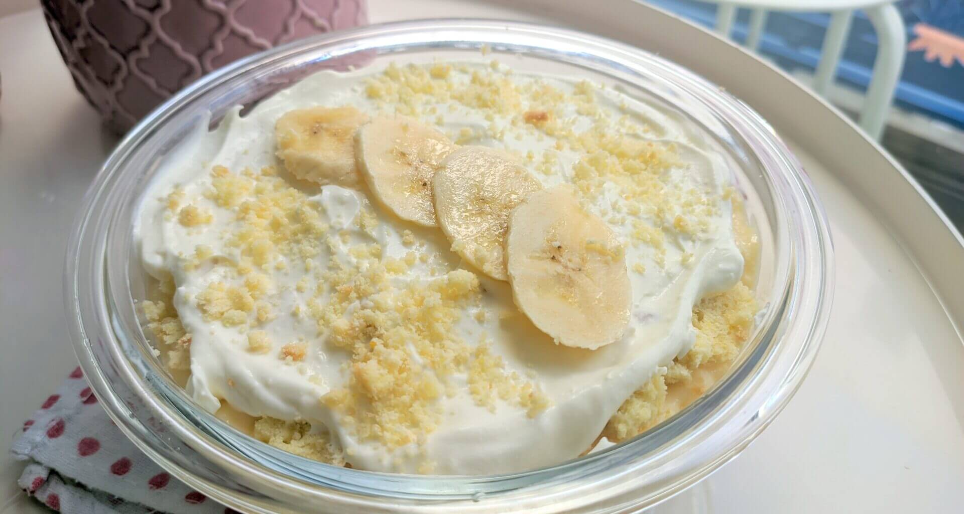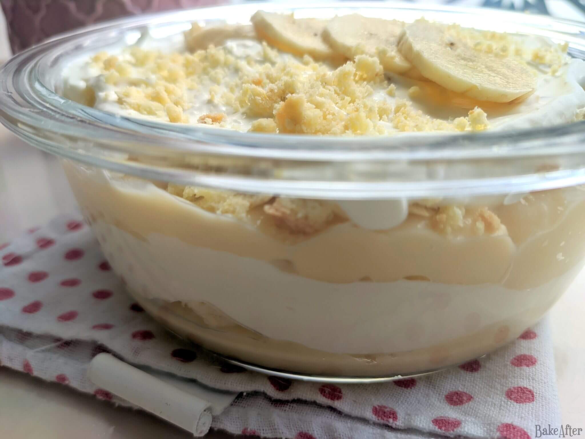 - Finally, just assemble it. I made pudding/cookie/banana/whipped cream layers until I had 3 layers. I finished the top with whipped cream, crushed cookies sprinkled on top, and a few slices of banana, and it’s ready to serve. Or you can put it back in the refrigerator. It will keep well for 1 day in the refrigerator, but any longer than that and you risk the banana starting to oxidize. Enjoy!