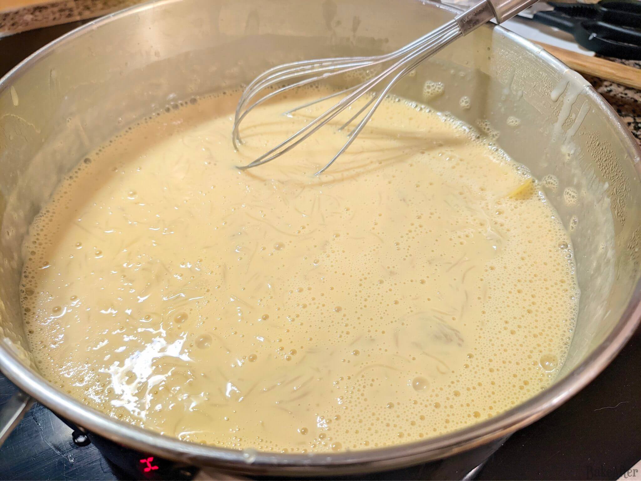 - Whisk the egg yolks well, then pour small spoonfuls of the milk and vermicelli mixture over the egg yolks, stirring constantly. Do this gradually to increase the temperature of the egg yolks without causing them to coagulate. When the egg yolk and liquid mixture is well blended and warm, pour everything back into the pan.