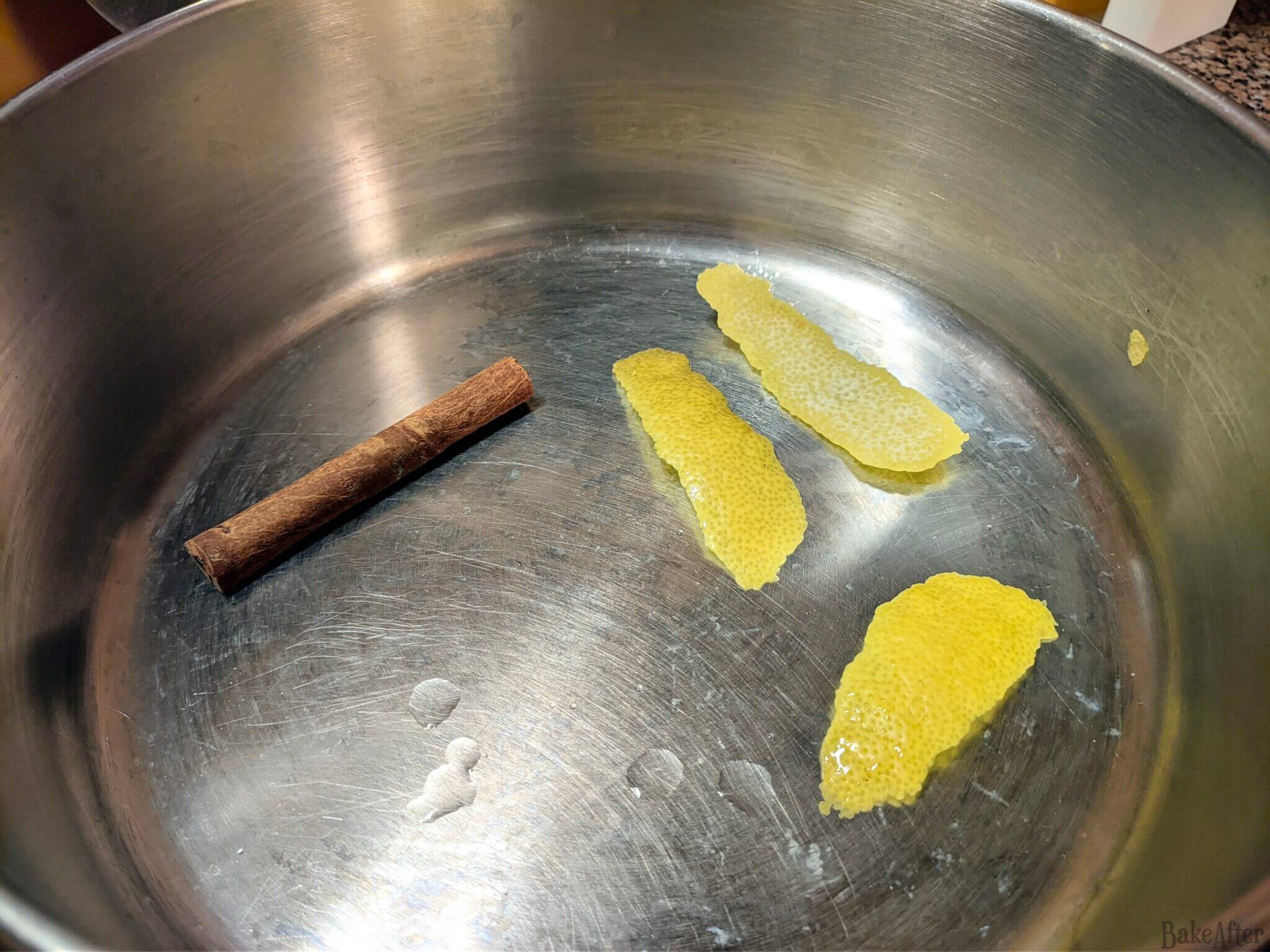- Start by placing the cinnamon stick and 3 lemon zest strips in a large saucepan, then add the full fat milk and heat it up without boiling.