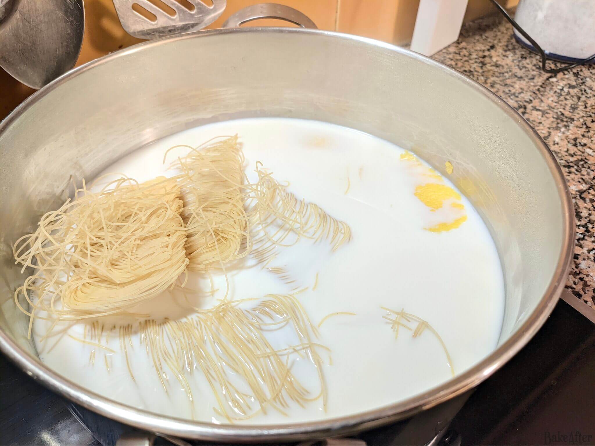 - Whisk the egg yolks well, then pour small spoonfuls of the milk and vermicelli mixture over the egg yolks, stirring constantly. Do this gradually to increase the temperature of the egg yolks without causing them to coagulate. When the egg yolk and liquid mixture is well blended and warm, pour everything back into the pan.
