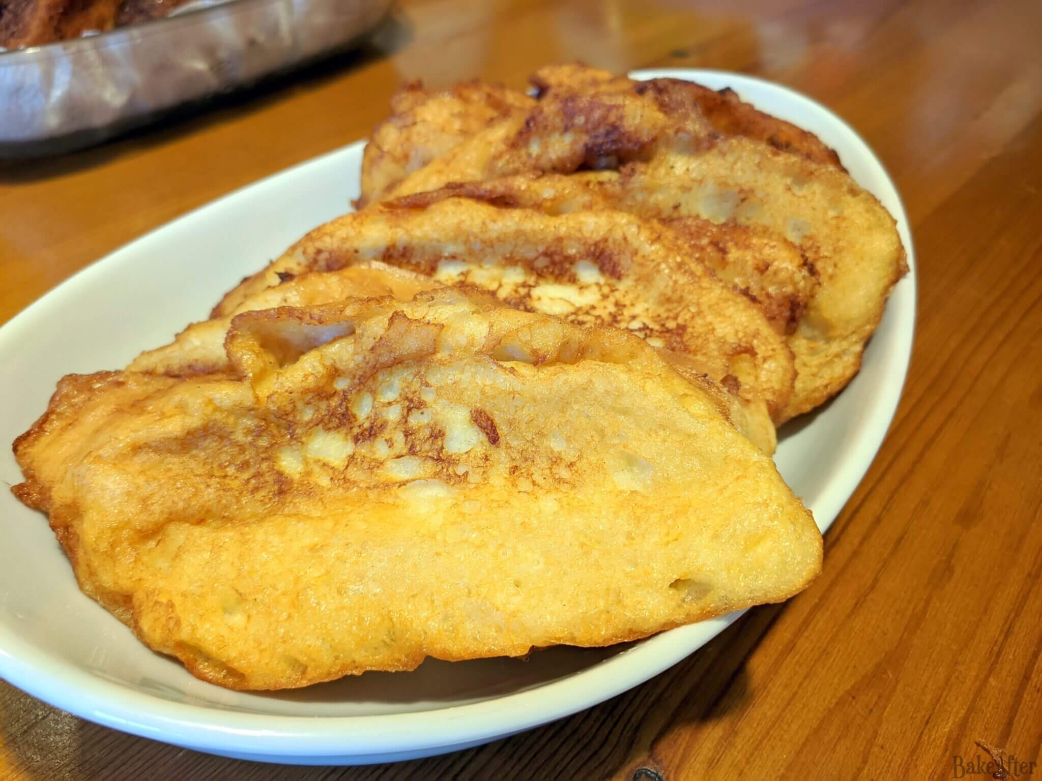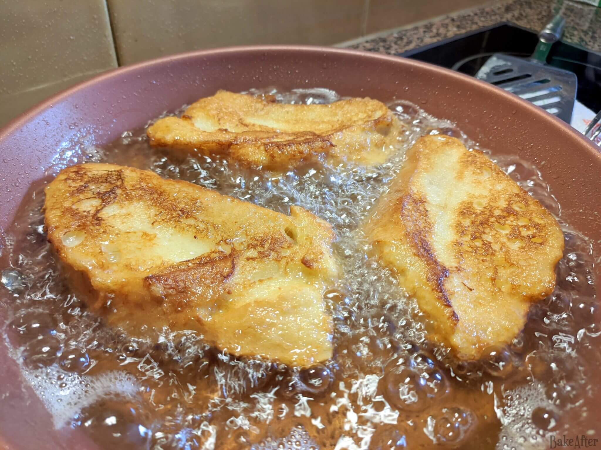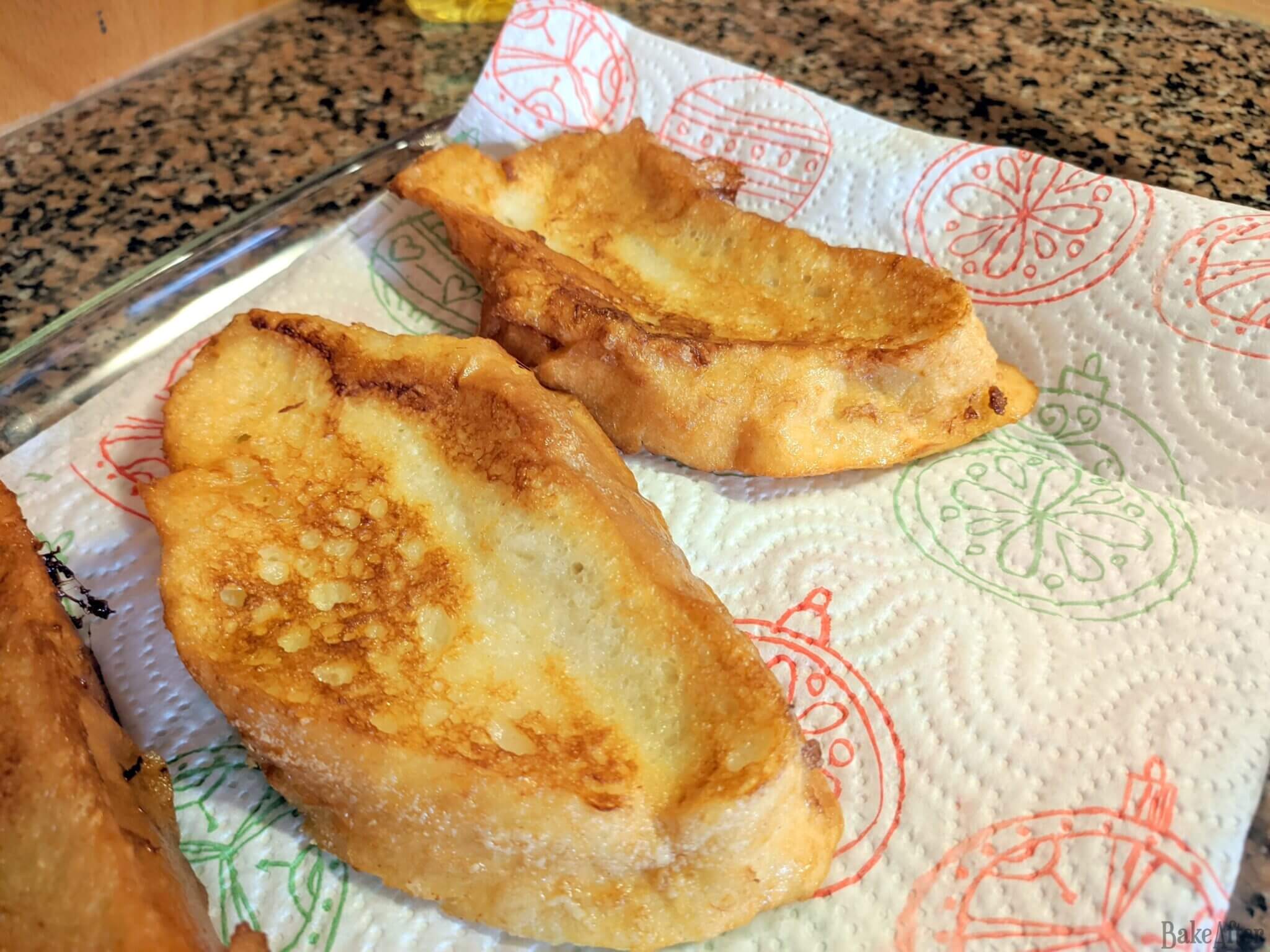 - In my case, I can fry 3 slices at a time. Repeat until you have no more bread. When golden brown, remove to kitchen paper towels or a draining rack, then put them all in a serving tray.