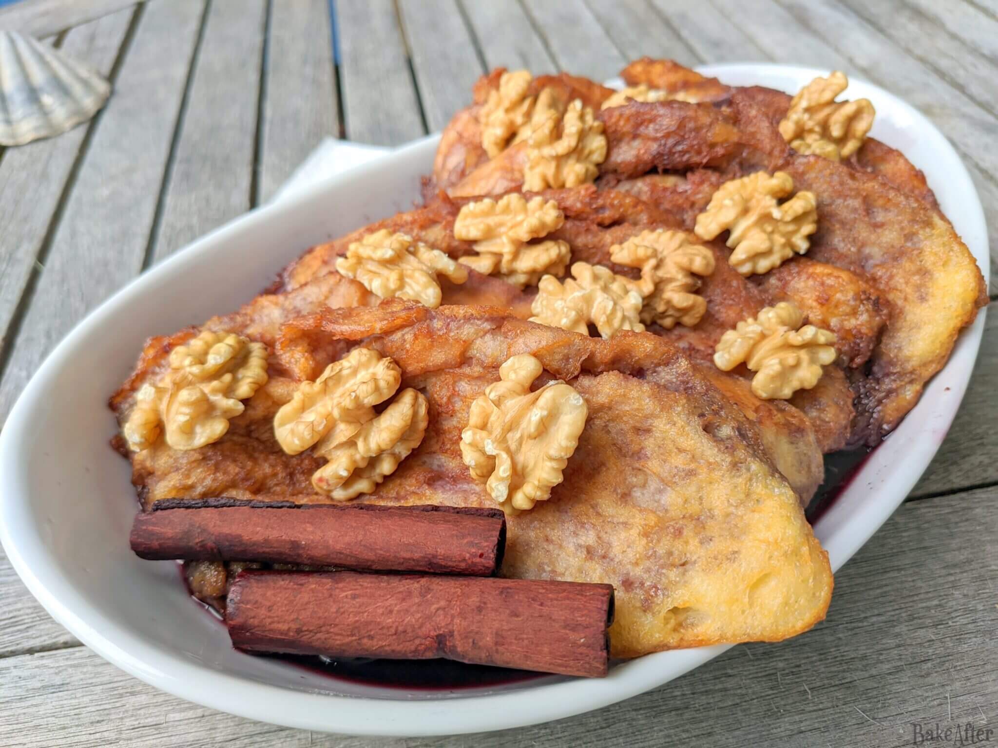I know it gets to December and it’s just Christmas recipes all day long hahaha, but today we have something special, a delicious variation of the classic Portuguese rabanada (sweet deep fried French toast), featuring a luscious Port wine syrup, wallnuts with some hints of cinnamon. But you can make this exact recipe with red wine or white wine, no problem at all. It’s also known as “fatias paridas com vinho” golden slices with wine, and is quite common in northern Portugal, where these beauties are served bathed in this sweet wine syrup.
