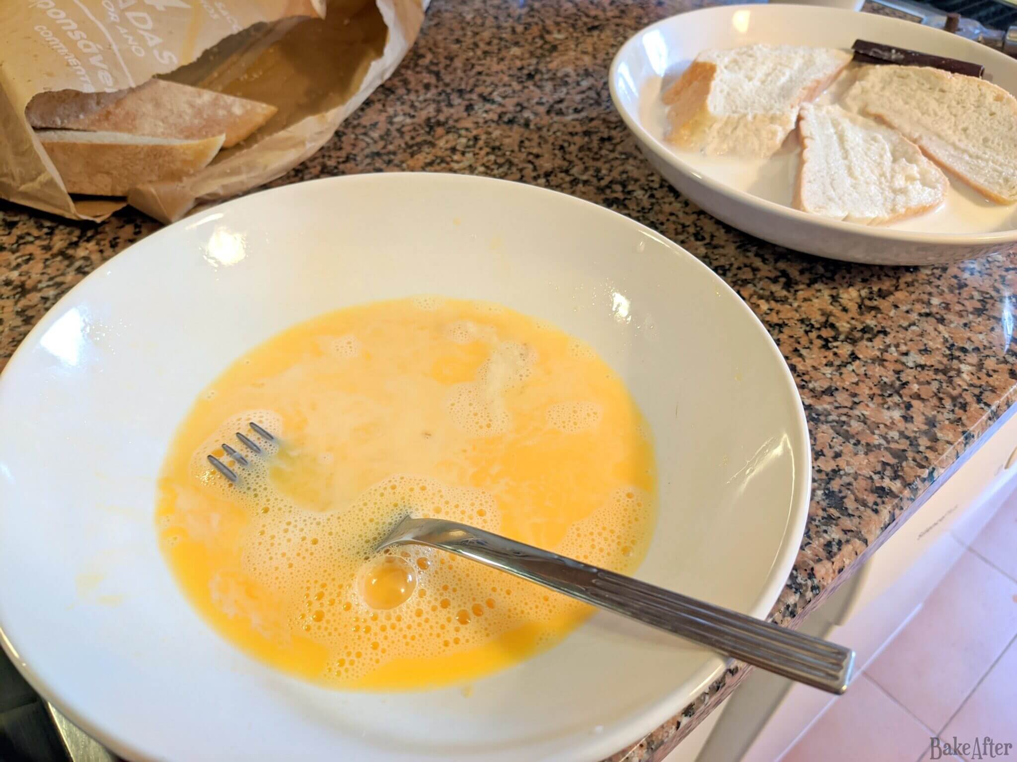- Dip the bread in the hot milk, let the bread absorb the milk, turn the bread over, remove the slice of bread and let it drain a little in your hand, then dip it in the whisked egg, drain a little and gently put it into the hot oil, then fry both sides until golden brown.
