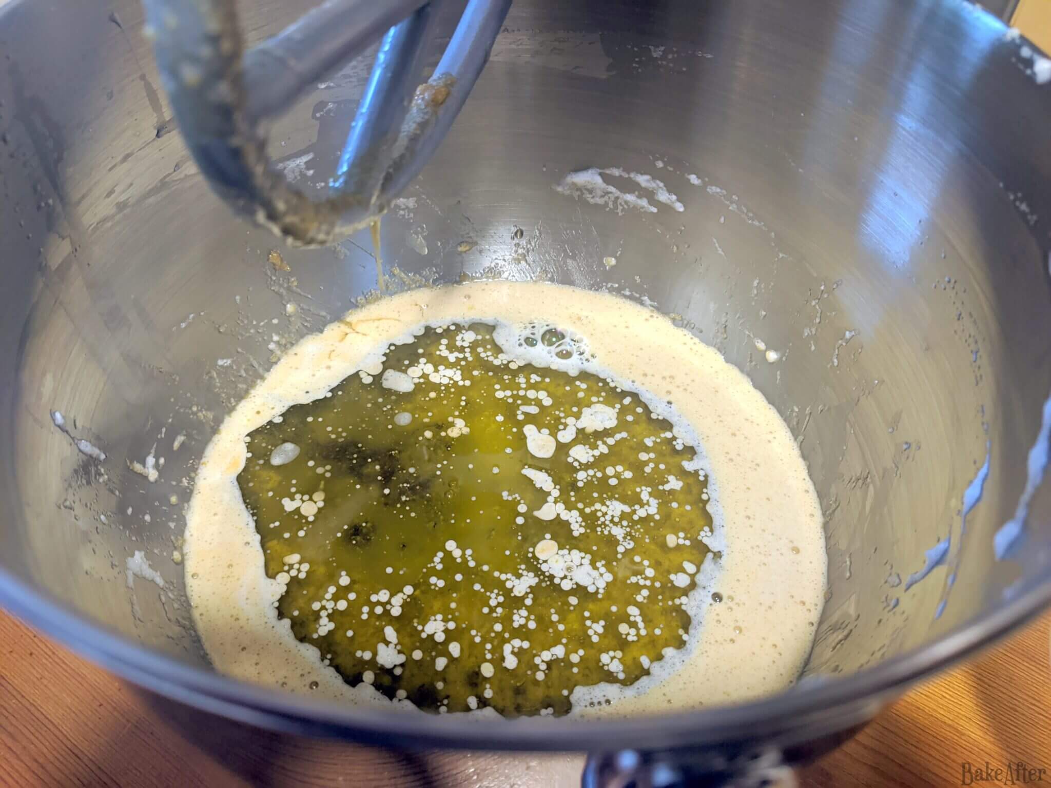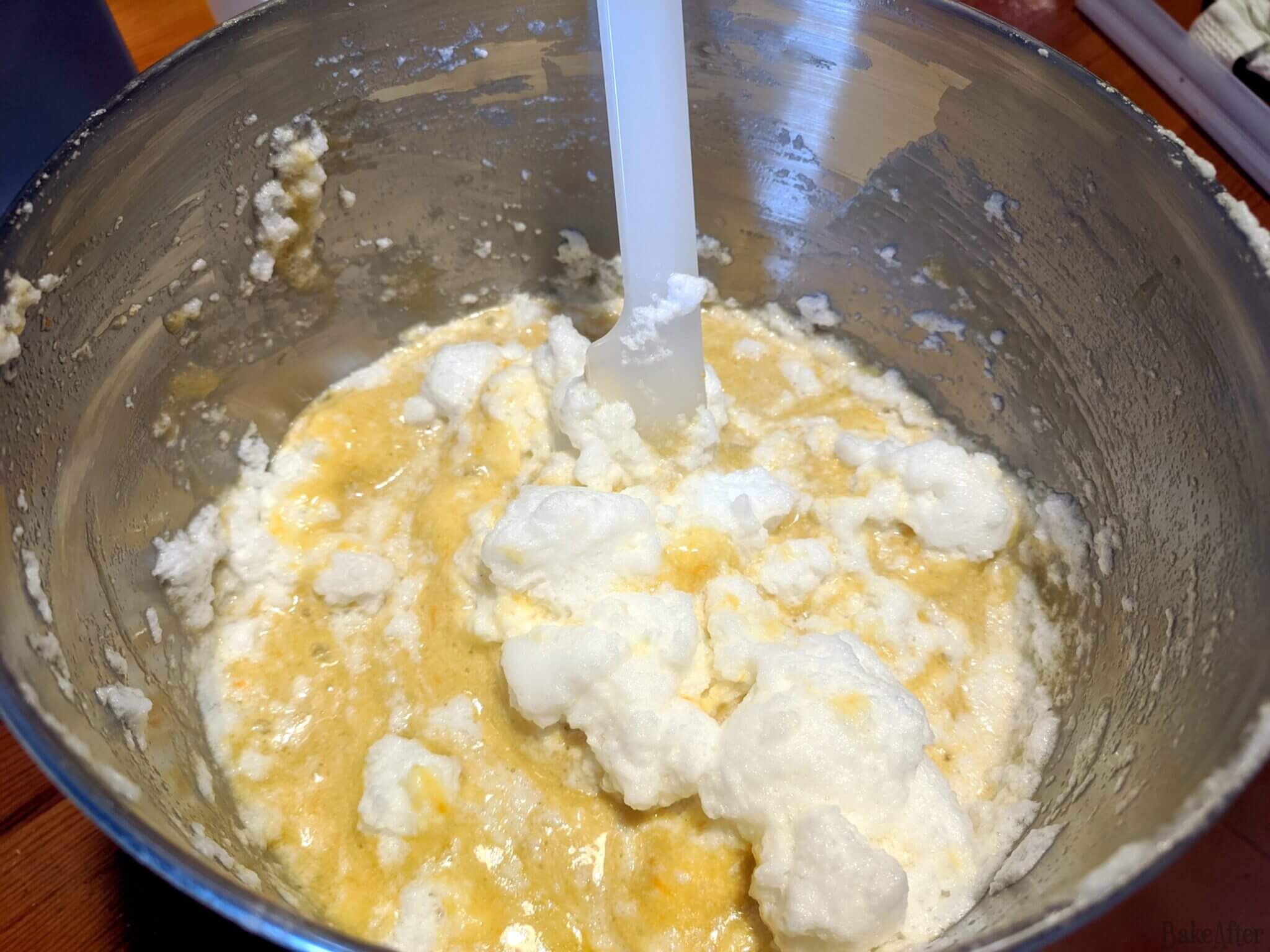 When folding in the whisked egg whites, use a gentle hand and a spatula, you want to maintain as much air as possible inside the dough for a lighter texture.
