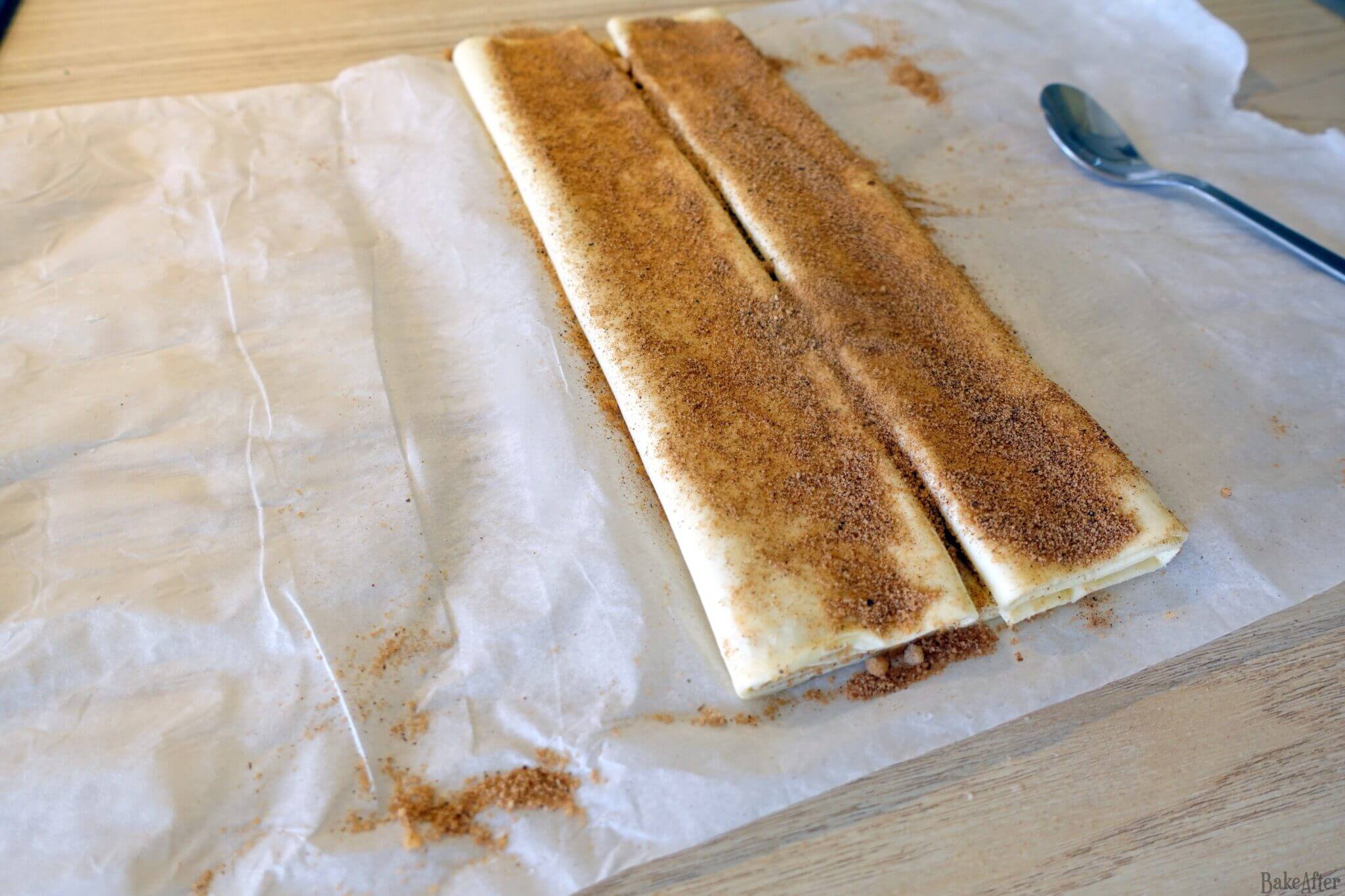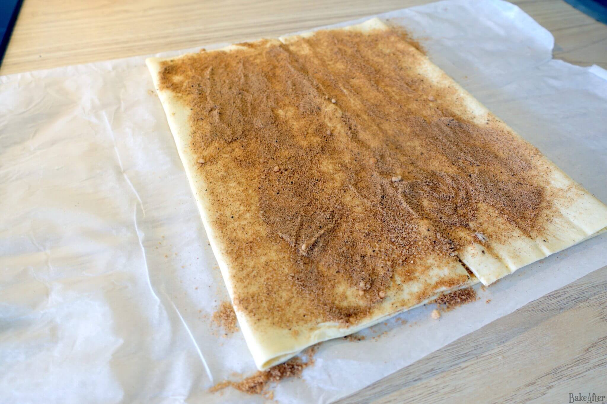 - Now sprinkle the puff pastry generously with about half of your spice and sugar mixture.