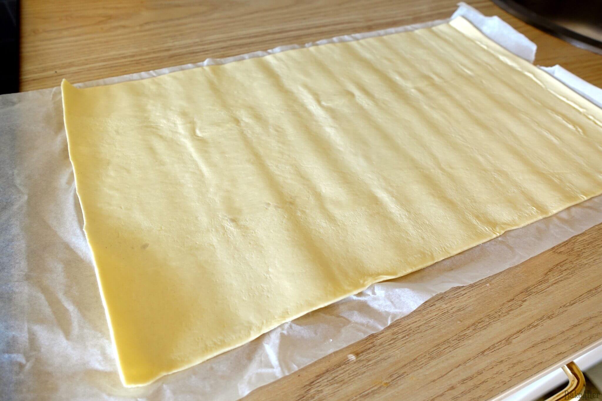 - Buy a rectangular sheet of puff pastry for this recipe, then remove it from the refrigerator and roll it out.