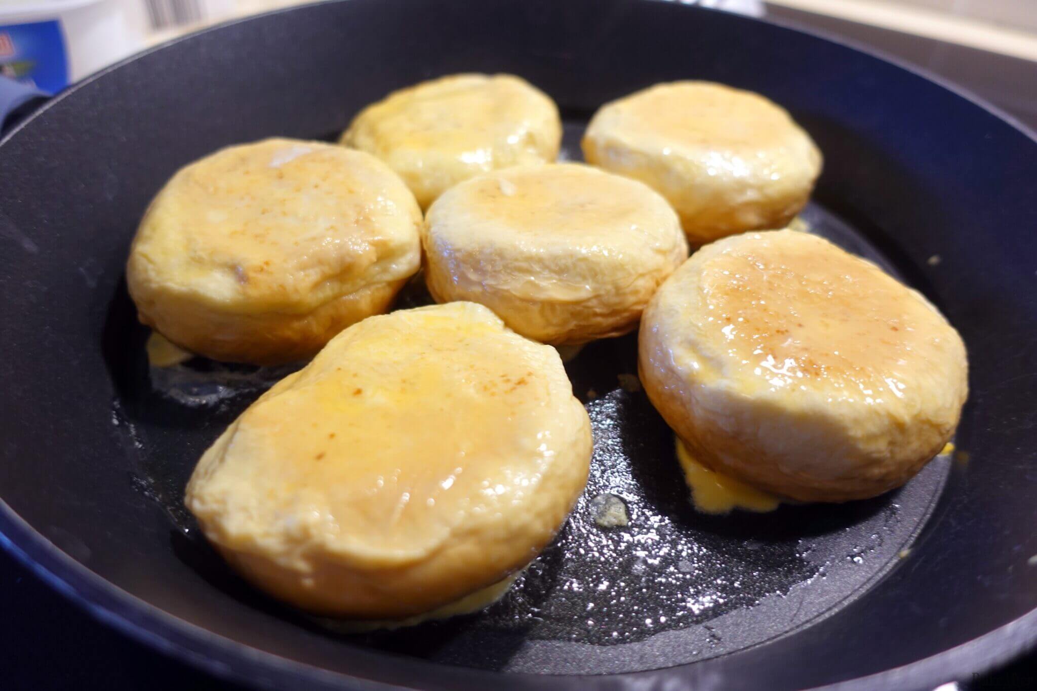 - Then quickly dip each one thoroughly in the whisked eggs and place them in the skillet, repeat for all the rolls.