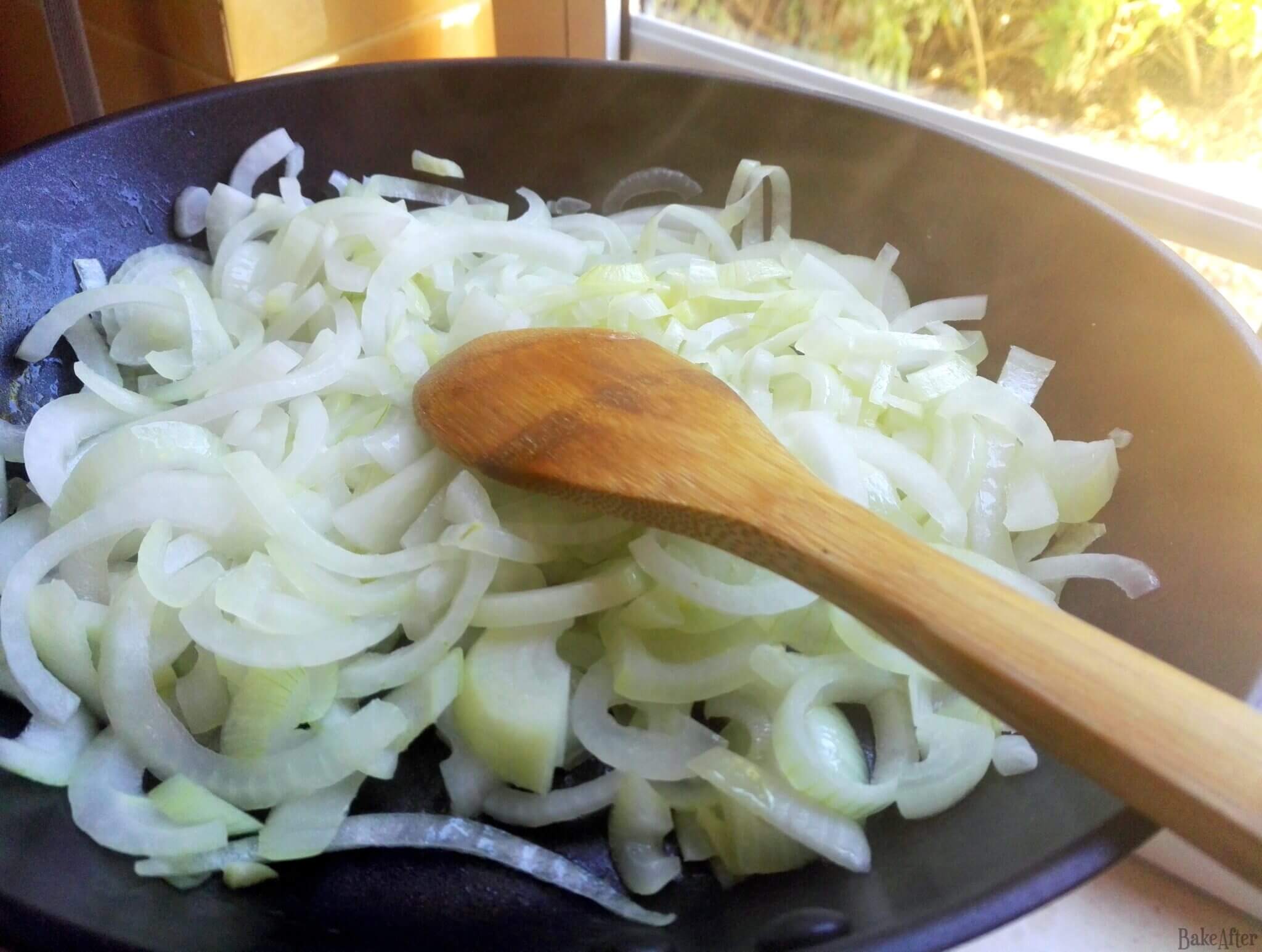 2. In a frying pan with a drizzle of olive oil, add 2 and 1/2 onions, sliced ​​into strips. Season with a pinch of salt and sauté slowly until the onions are golden brown, don’t rush.