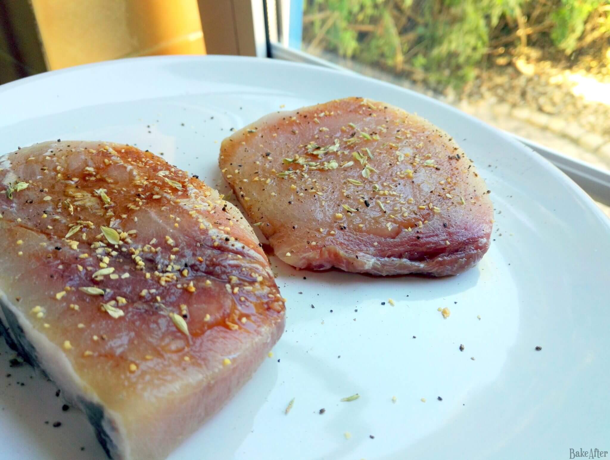 1. Start by seasoning the tuna with a pinch of salt, pepper, dried garlic, and dried oregano; set aside.