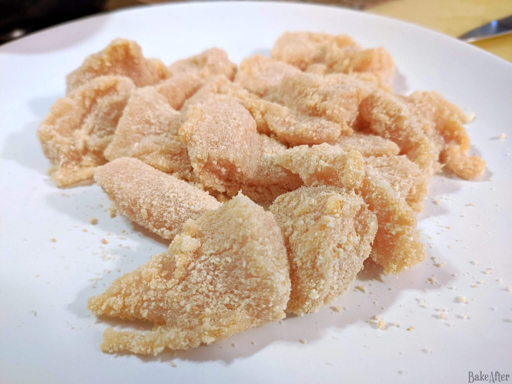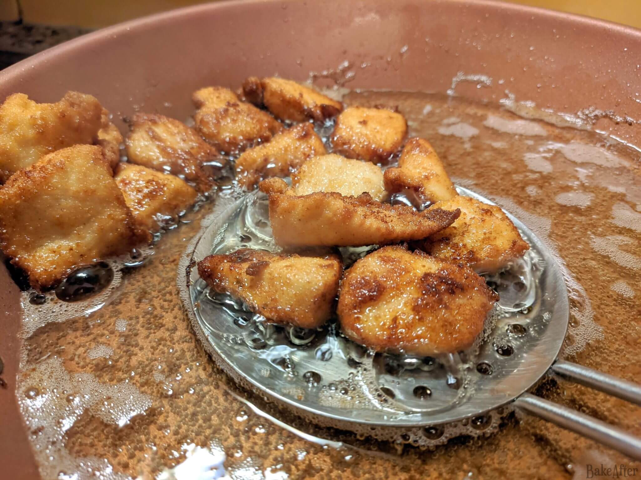 Getting the oil to the right temperature is crucial. Too hot and the coating burns before the chicken cooks, too cool and you get greasy, soggy nuggets. The bread test is foolproof if you don’t have a thermometer.
