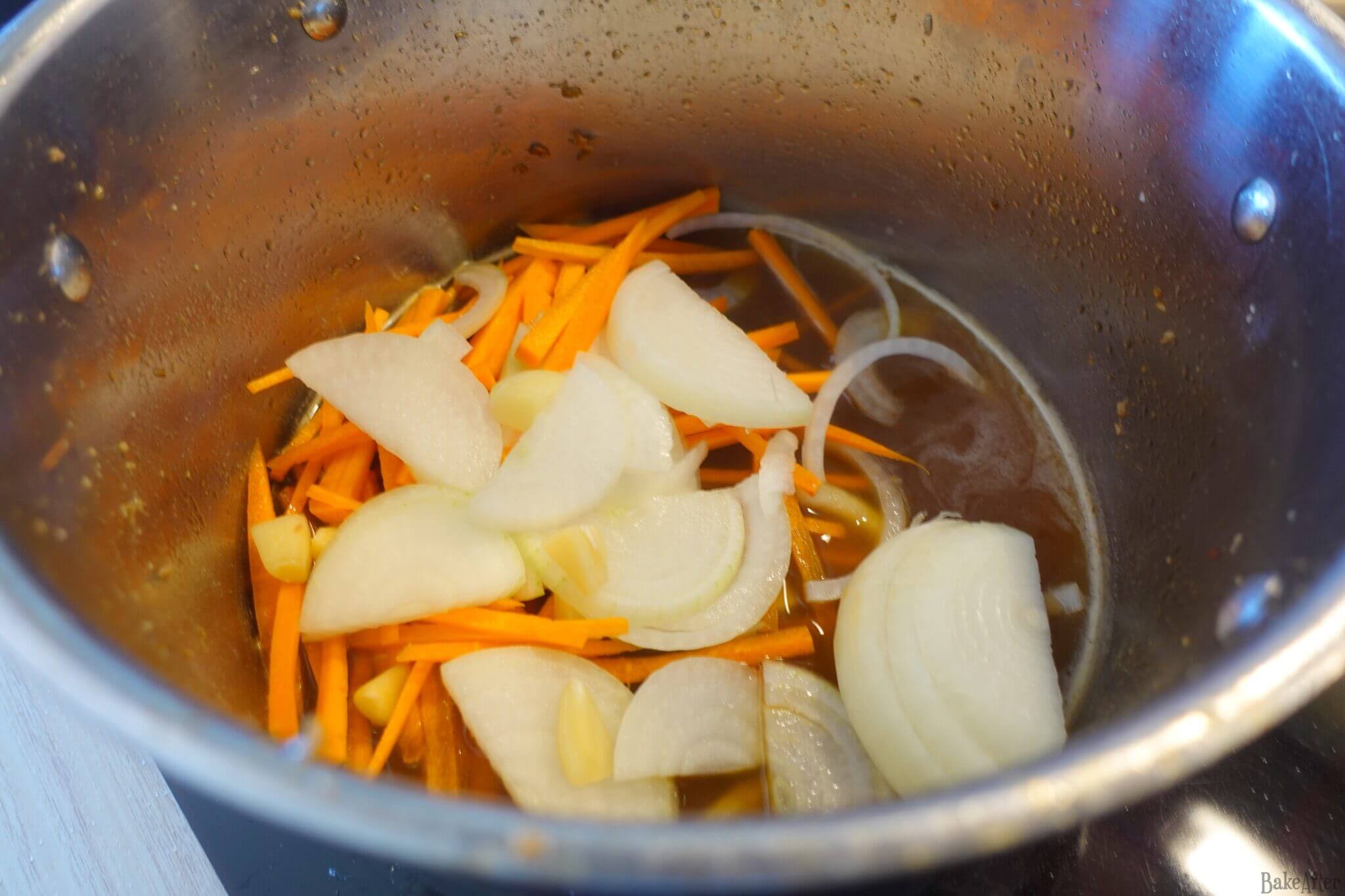 - Julienne the carrots, finely chop the onion, and roughly chop the garlic, then add them to the pan.