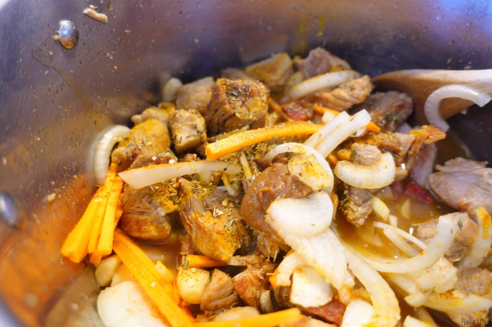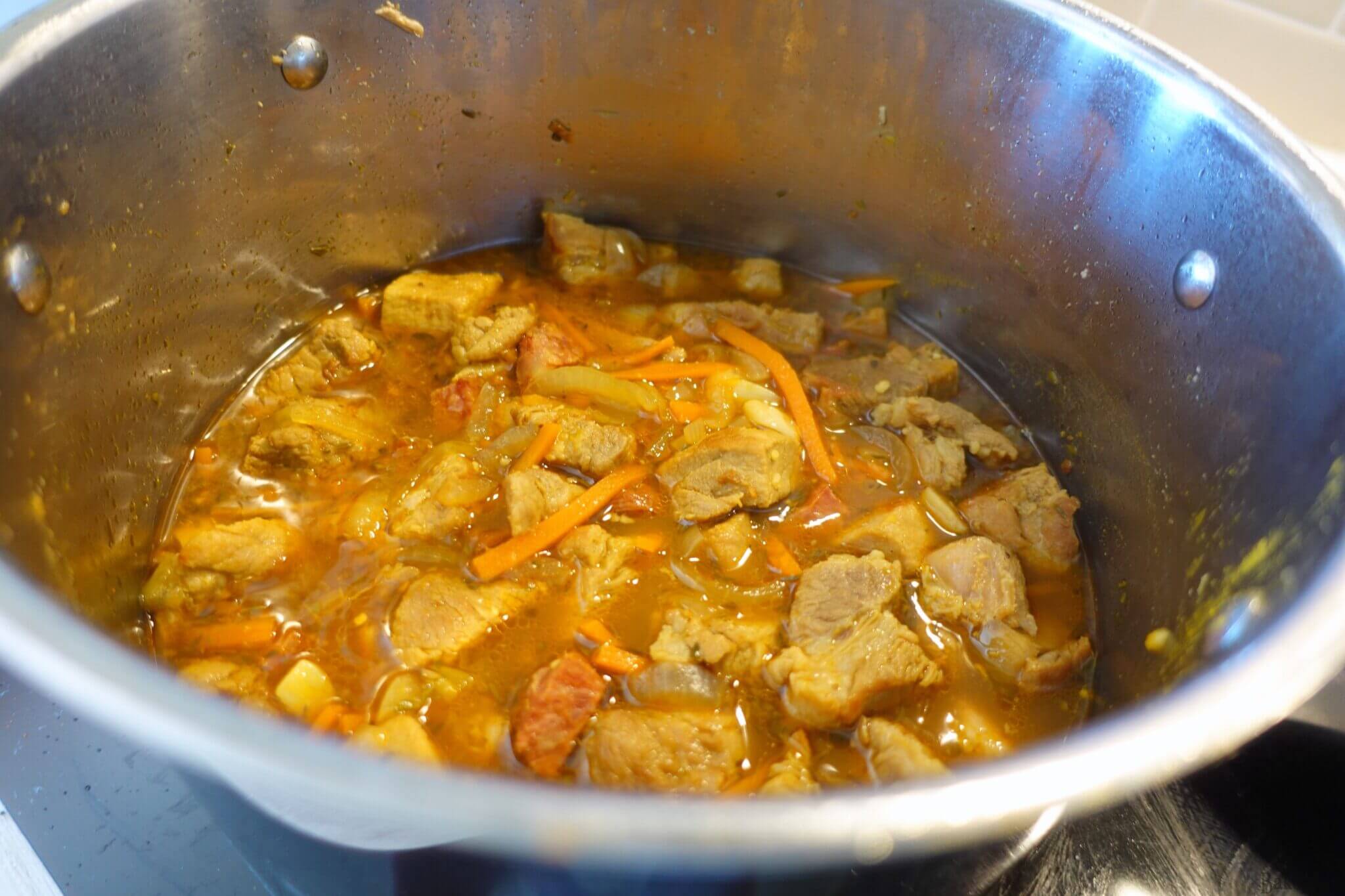 - Cover and cook over medium/low heat for 2 hours (you can go up to 3 hours depending on the cut of meat) until everything is tender.