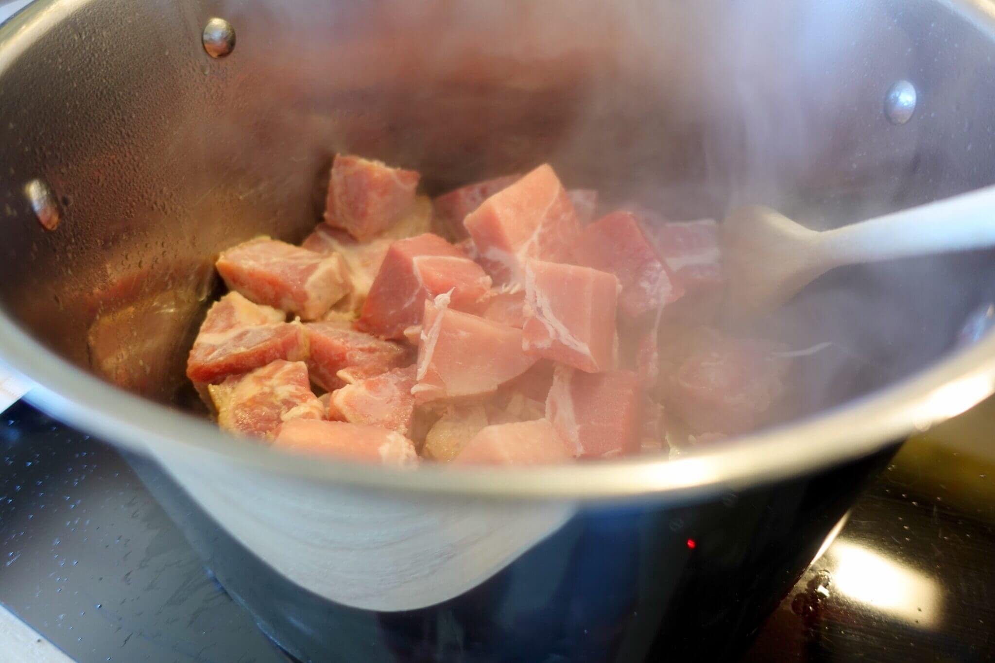 - Start by cutting the meat into cubes, you can of course cook the whole piece, but it will take way longer and it will get much drier.