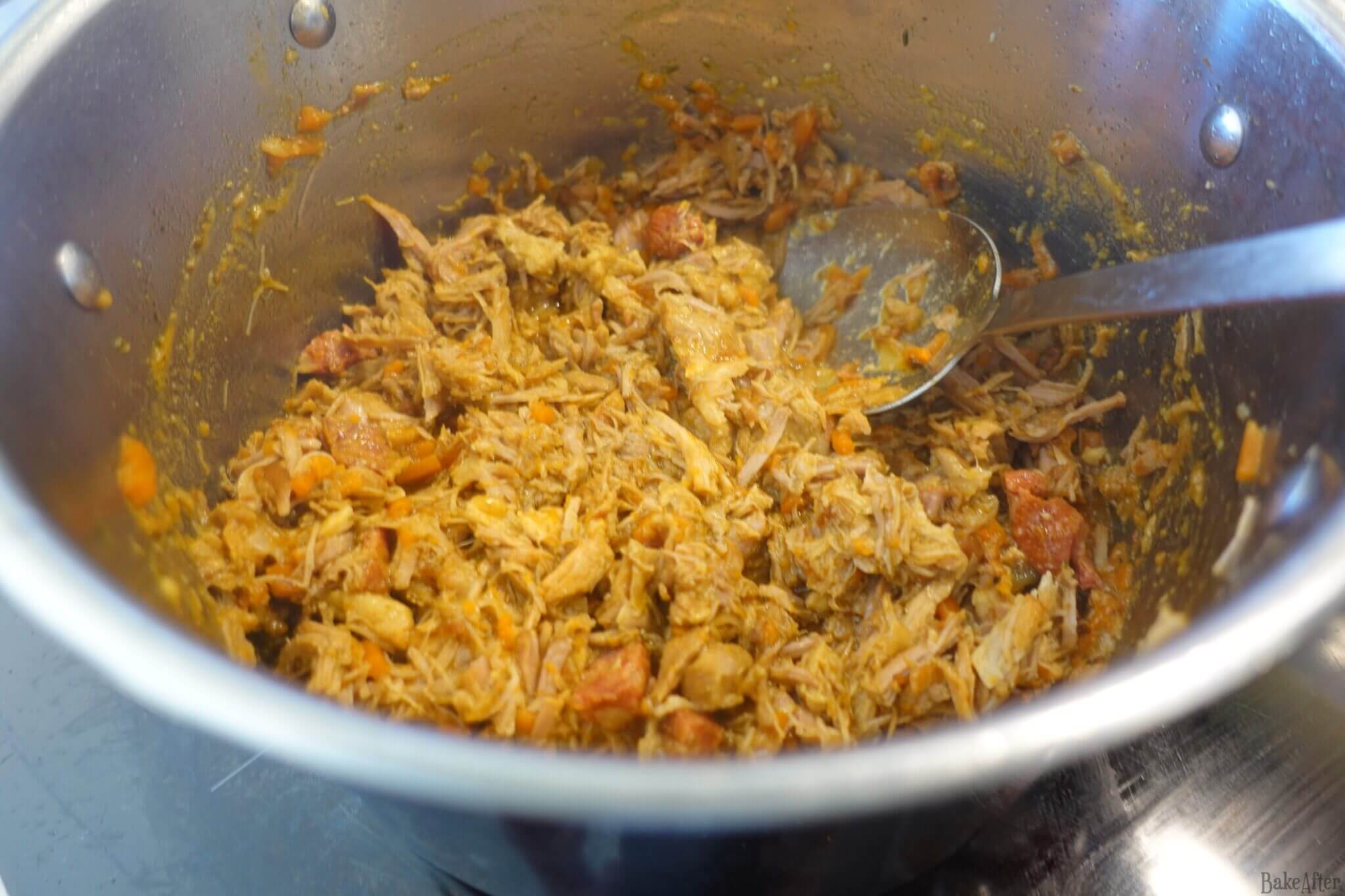Adjusting the spice level. If you want a spicier version, add more heat at the end of cooking rather than only at the beginning, long cooking times tend to mellow out even a lot of spice. Feel free to add chili flakes, hot sauce, or fresh piri-piri right at the finish. Everything goes well with pork! And yes the meat i used for the empanadas i took back to a frying pan to add a little more heat and to dry out a bit the meat, because filling that is too wet will not make good empanadas!