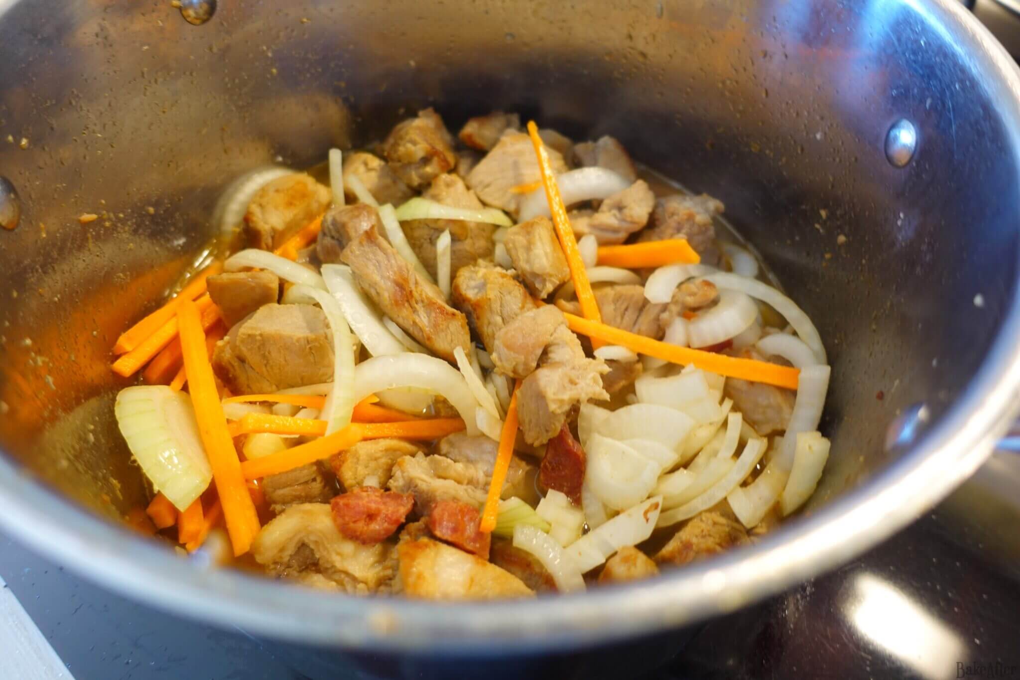 - Next, add the meat and chorizo, season with a tablespoon of miso, 1/2 meat bouillon cube (meat stock cube), about two tablespoons of soy sauce, a pinch of thyme, oregano, smoked paprika, cayenne pepper (adjust these two if you want it spicier or not), ground cumin, salt, and pepper.