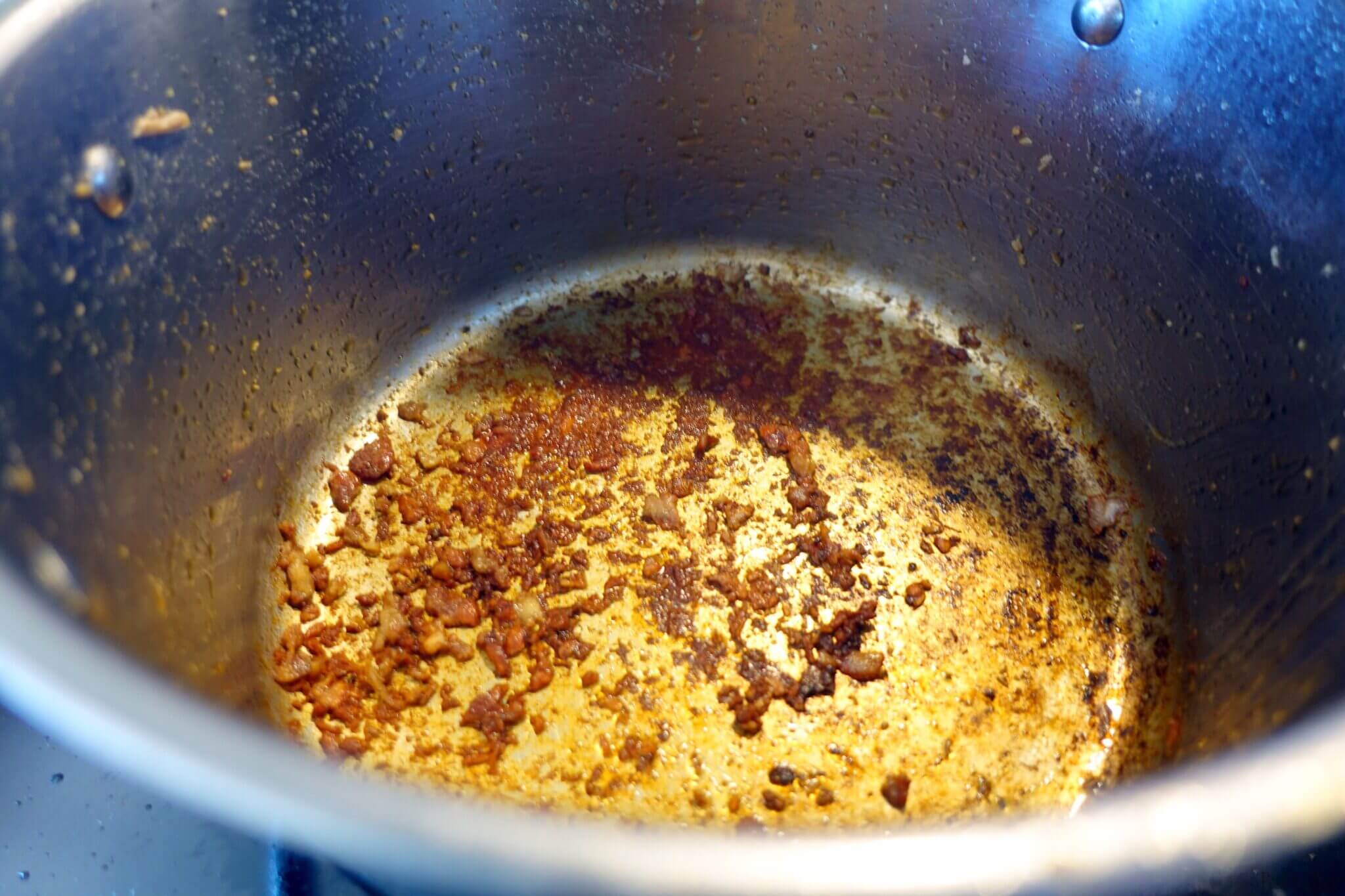 - When the meat is completely browned, remove it to a plate. You will see that some of the meat will stick to the bottom of the pan, but that’s okay. Now add the beer, return the pan to the heat, and use a wooden spoon to scrape the bottom. Those burnt bits on the bottom just add more flavor to the sauce! 😀
