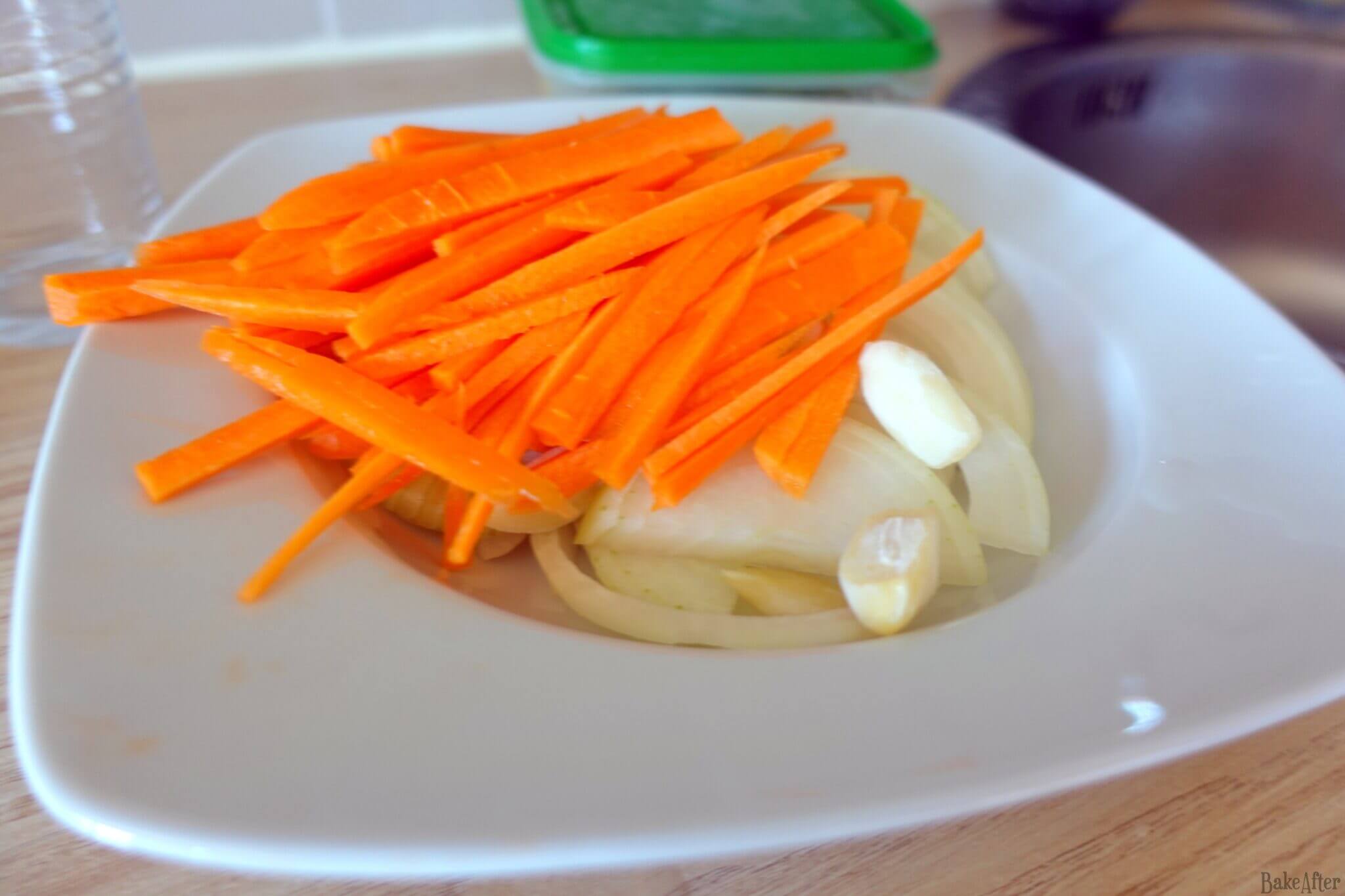 - Julienne the carrots, finely chop the onion, and roughly chop the garlic, then add them to the pan.