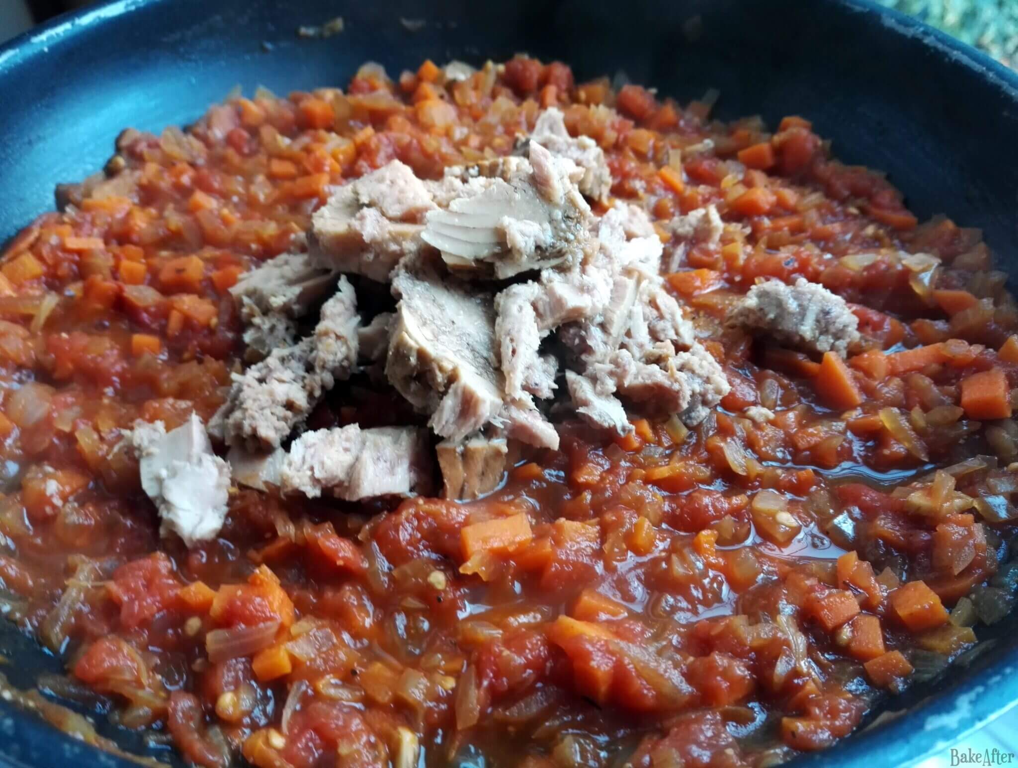 - Finally, drain the tuna and add it to the tomato. Season with a pinch of oregano, paprika, pepper, and salt, followed by a drizzle of soy sauce and fish sauce (the latter two are optional). Cook a little longer, but don’t overcook the tuna (remember that can tuna is already cooked, you just want it to dissolve into the sauce).
