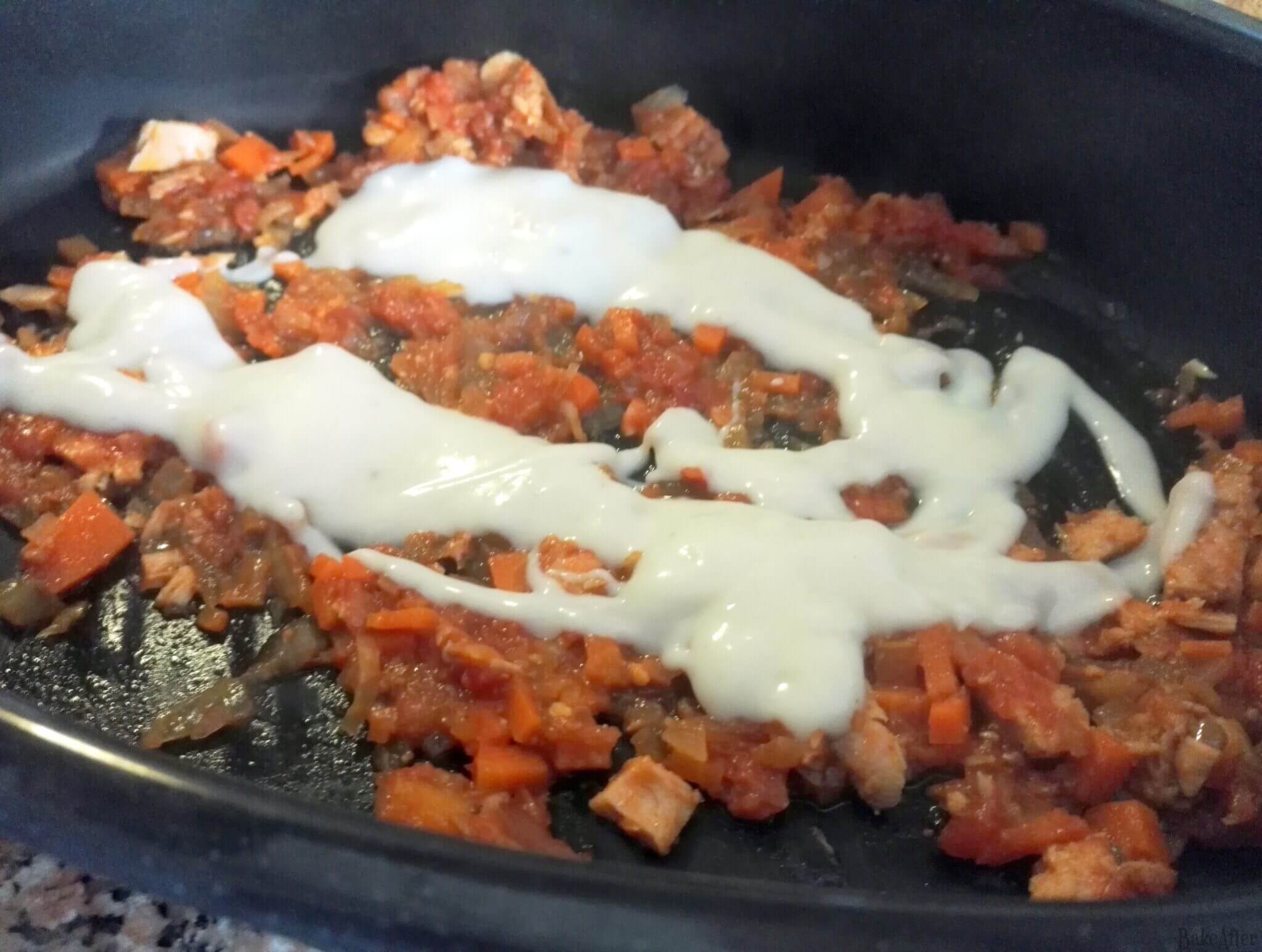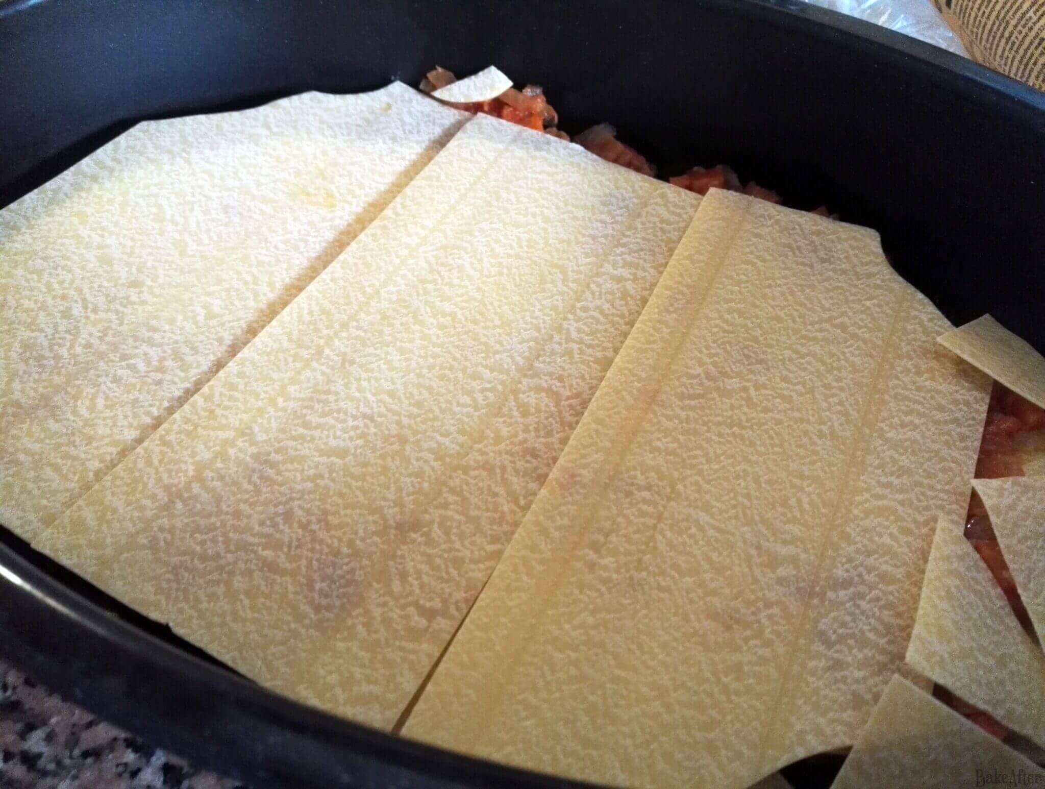 - Now put some tomato sauce on the bottom followed by some béchamel sauce, cover with pasta.