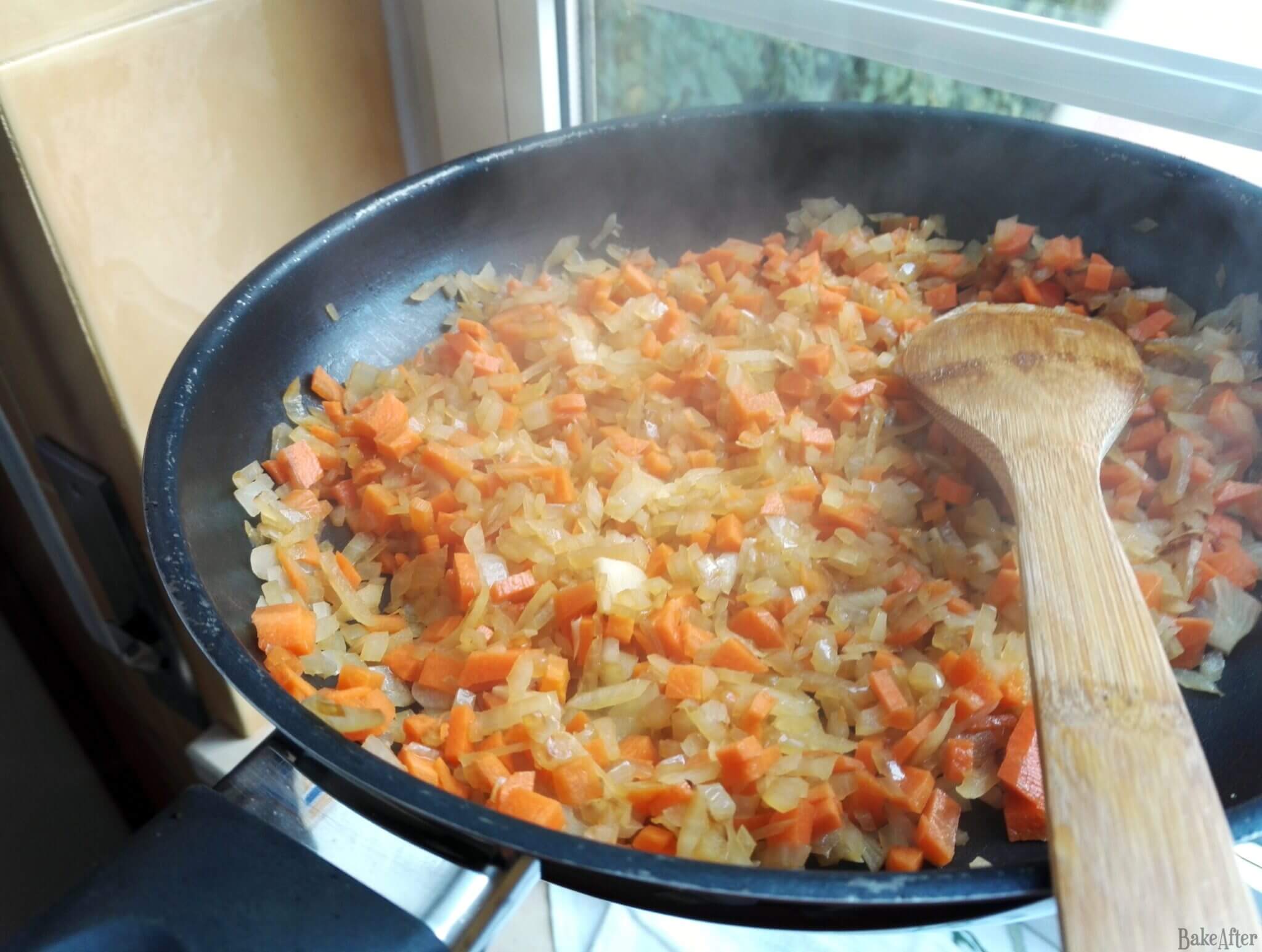 - First, sauté the chopped onion, garlic, and carrots in a pan with a drizzle of olive oil and a pinch of salt over medium heat. Sauté well.