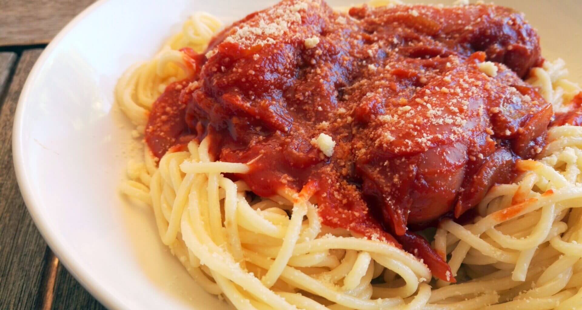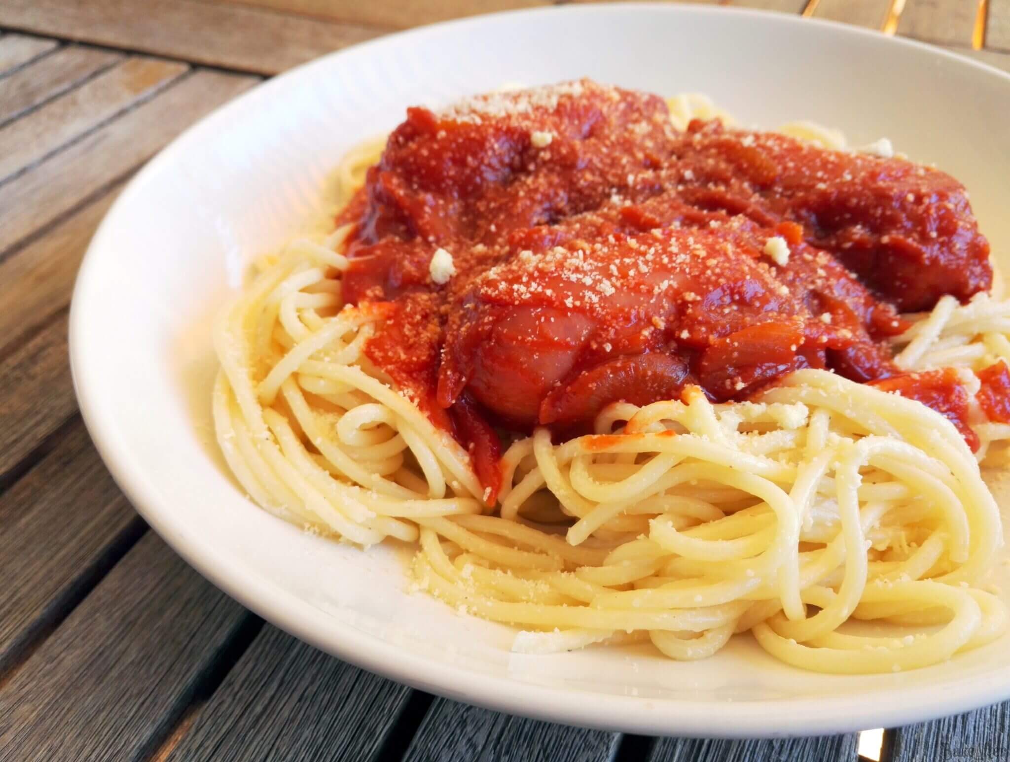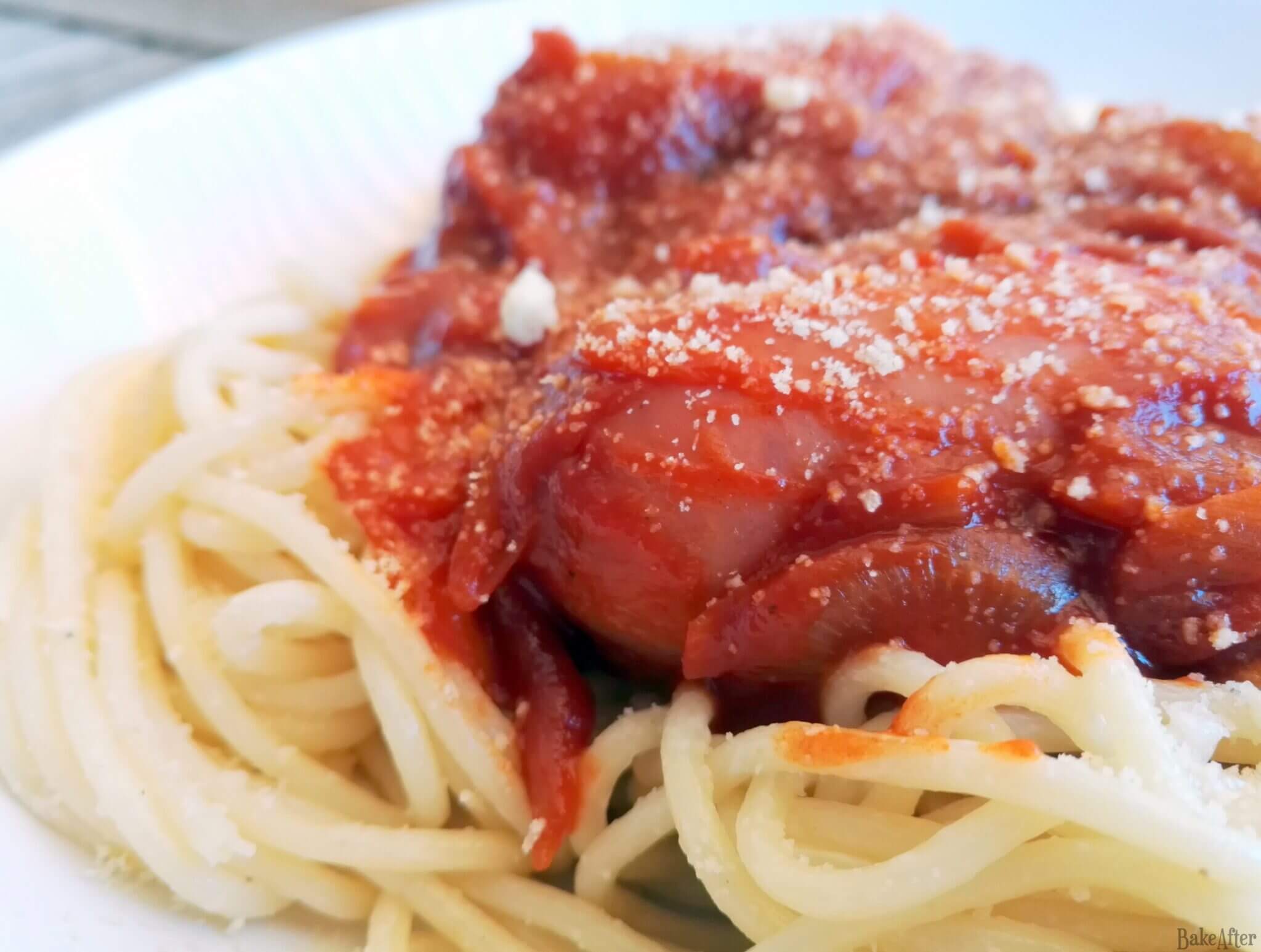 - Taste the tomato sauce and adjust the seasonings to your liking, then serve it over the spaghetti with a sprinkle of Parmesan cheese on top! Enjoy!