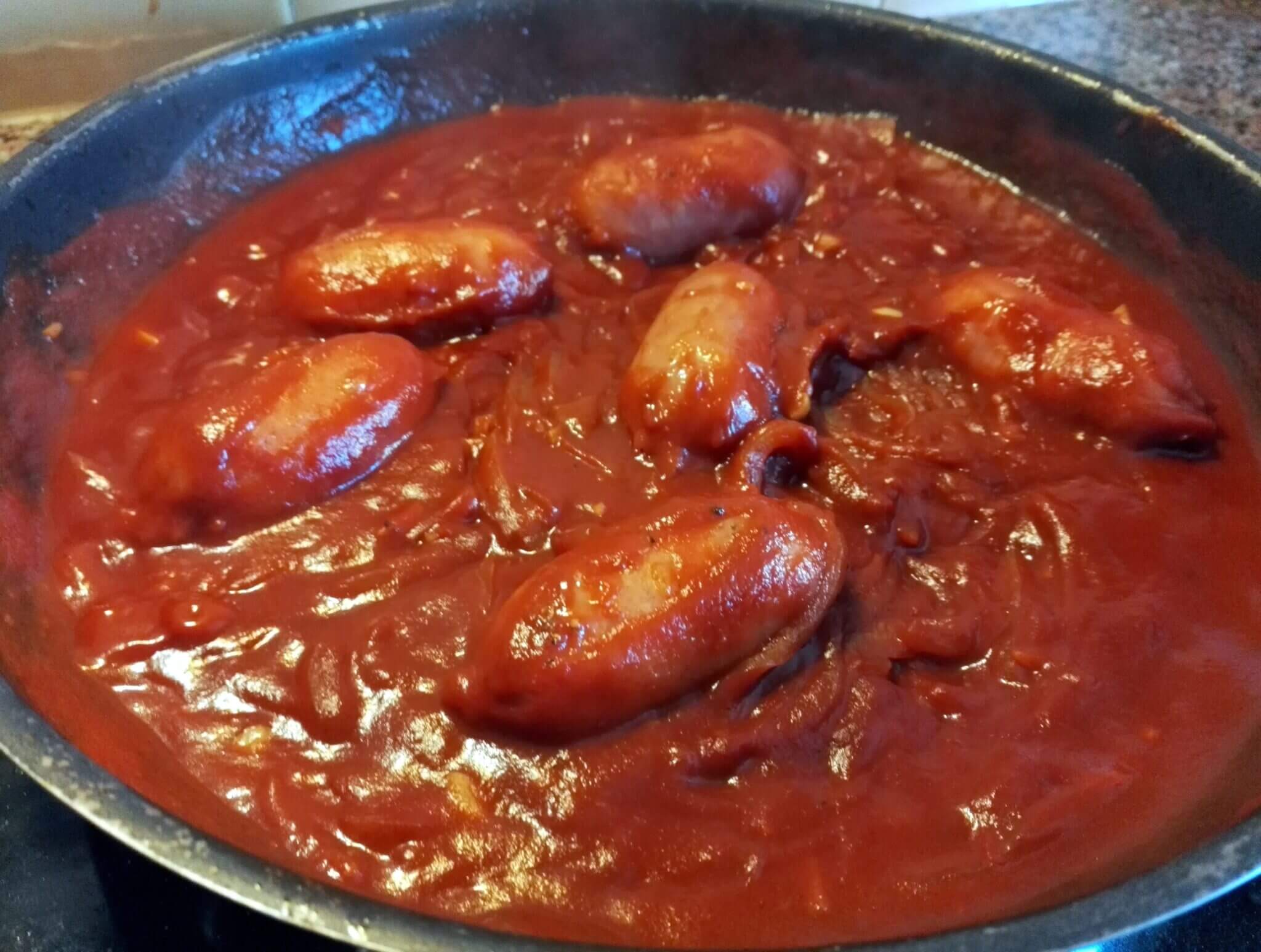 - Finally, add the tomato pulp, followed by a drizzle of Worcestershire sauce (or soy sauce), a pinch of sweet paprika, cayenne pepper, chili flakes, salt, and pepper. Cook for about 10 minutes to thicken the sauce and finish cooking the sausages.