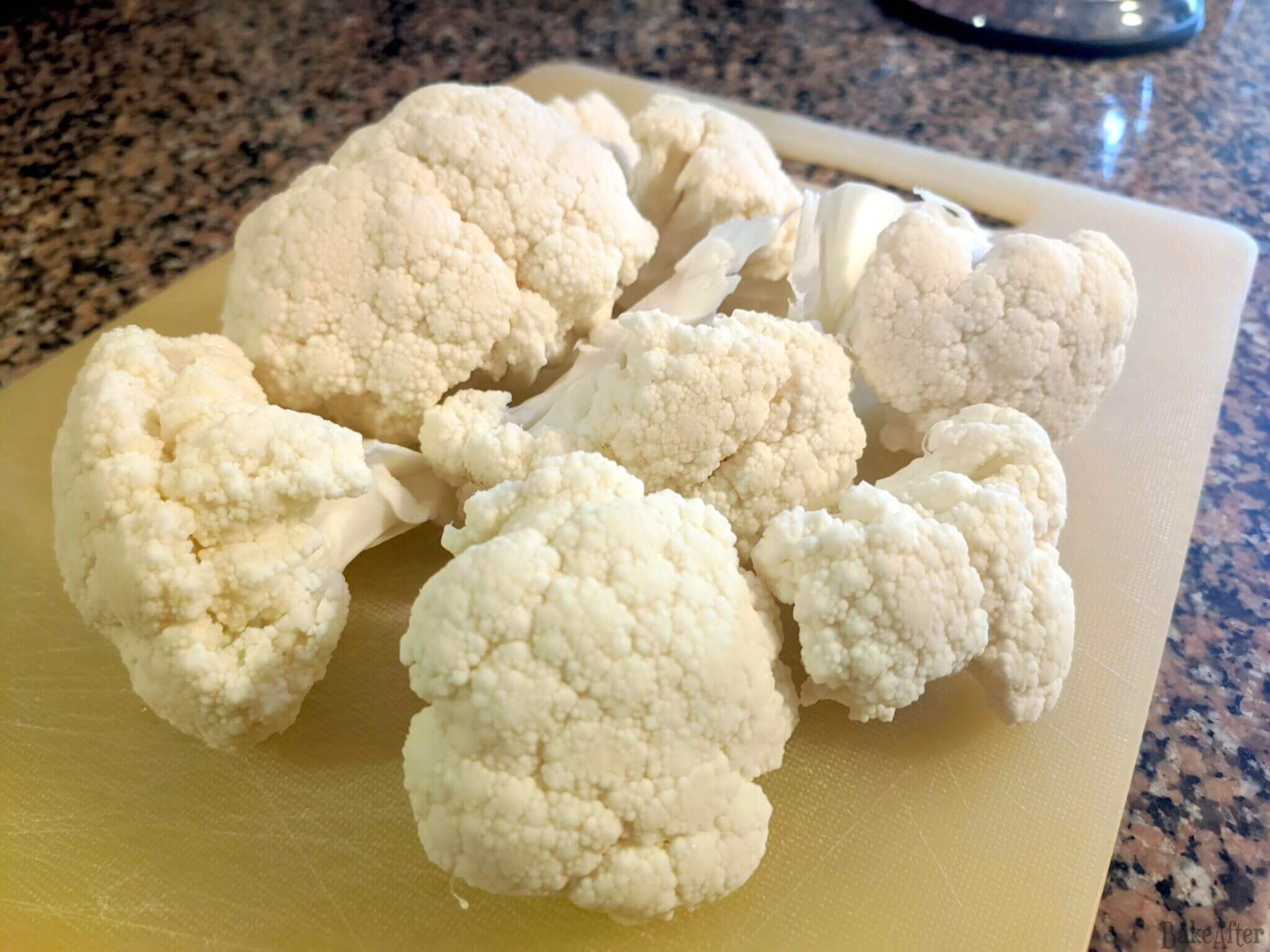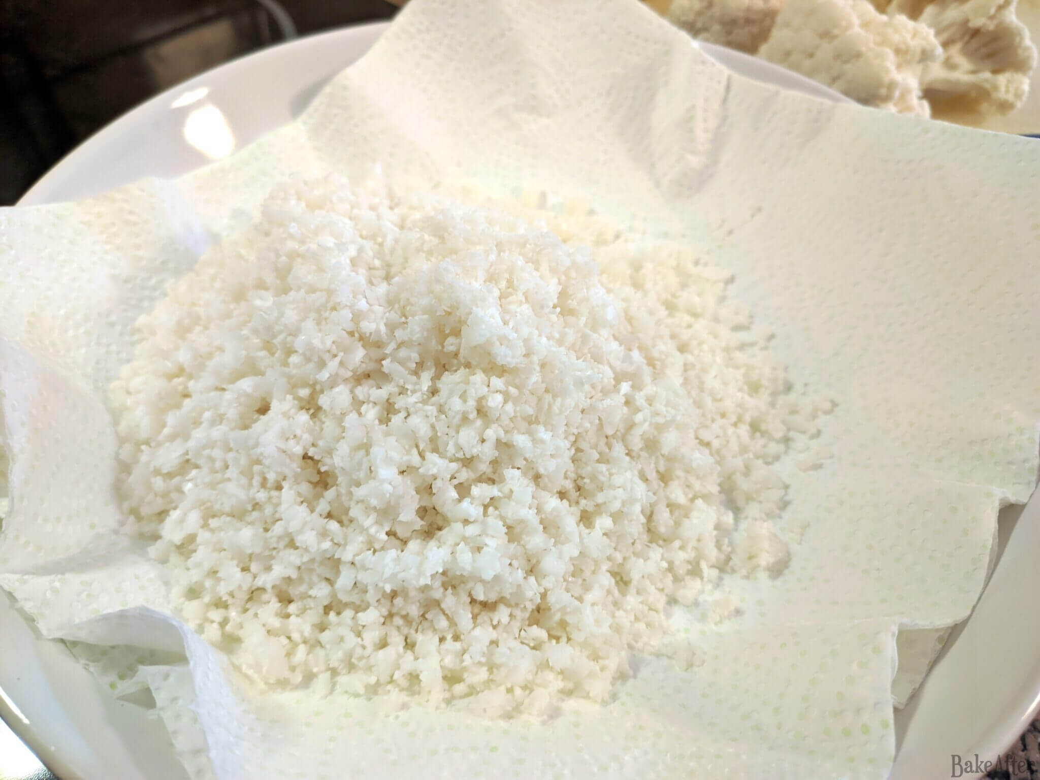 - Remove the chopped cauliflower to paper towels or kitchen paper. You’ll do this because when you chop the cauliflower, it will release too much water. Put a little more paper towel on top and press down a little to remove most of the excess water.