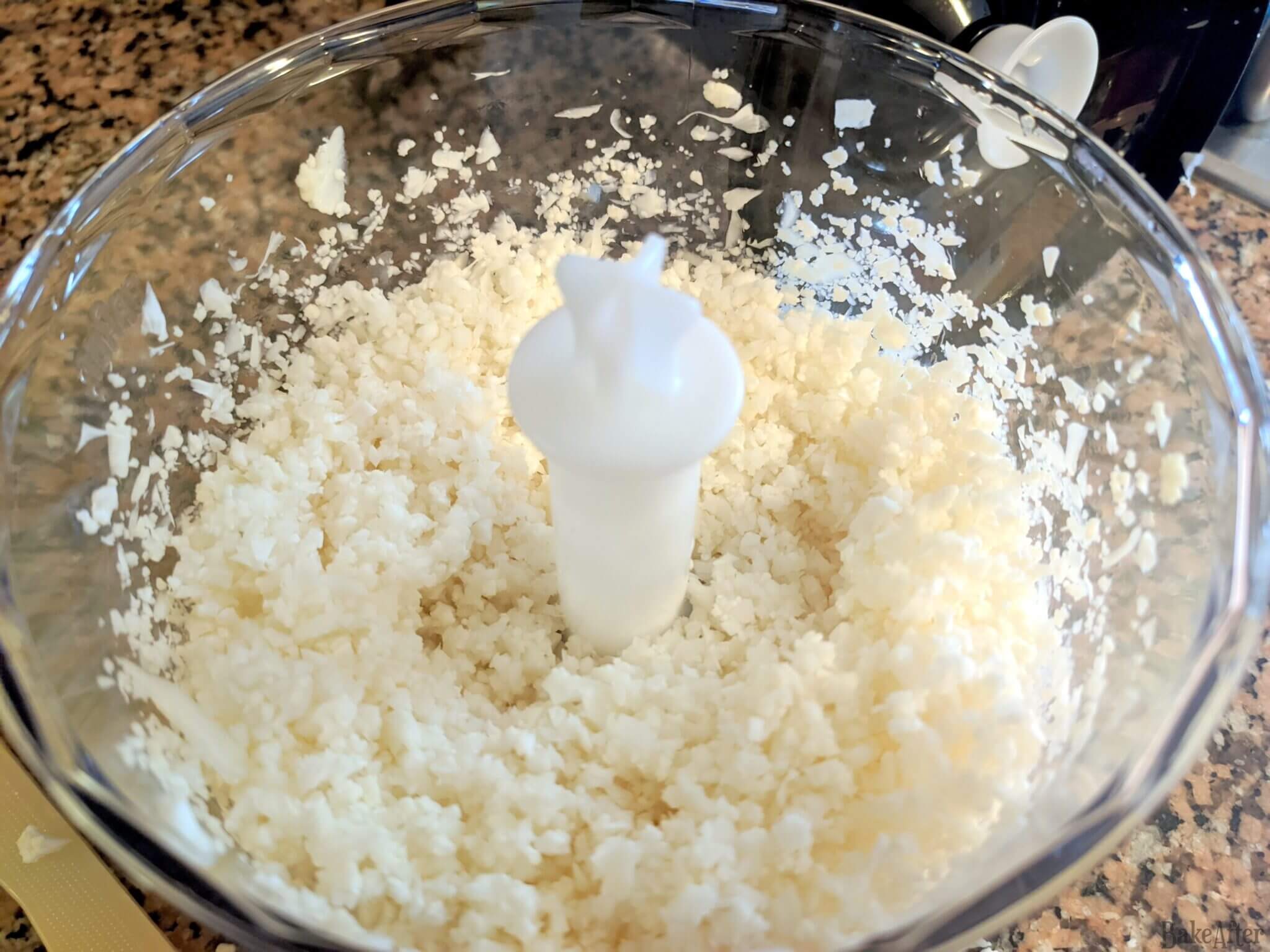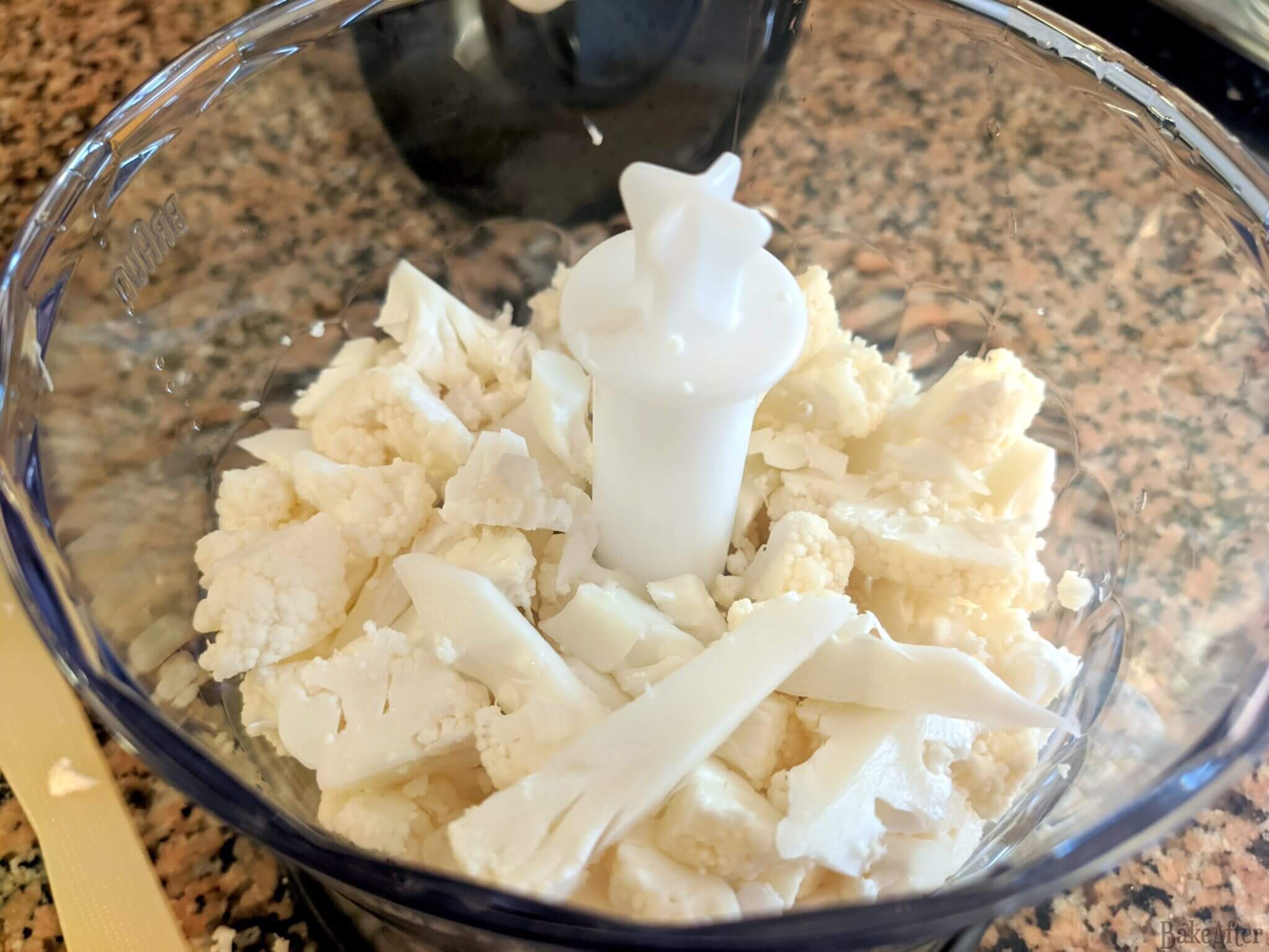 - Start by breaking up the cauliflower head. There’s no need to trim the stalks, use the whole thing. Put it in a food processor and chop until you have grains the size of rice.