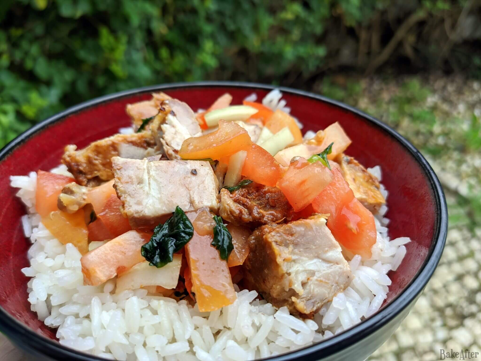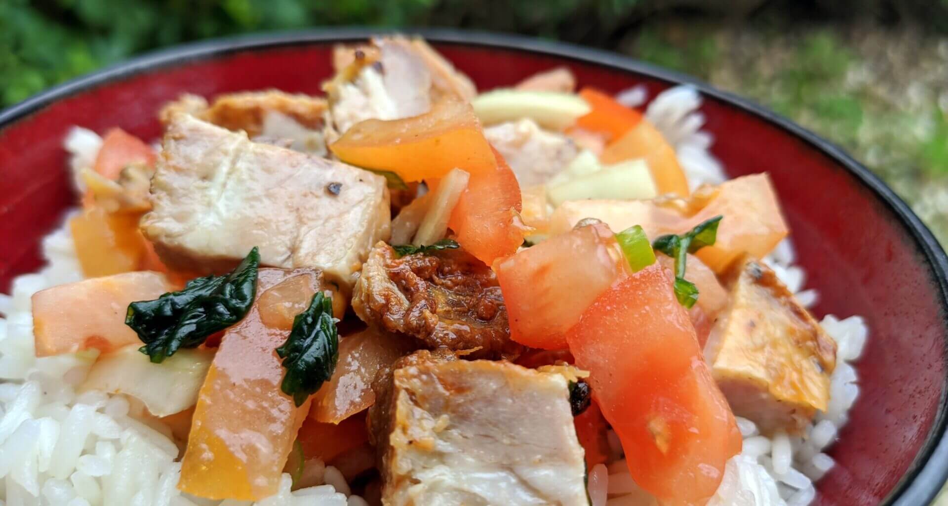 - While the rice is cooking, remove the bones and cut the ribs into cubes, place in a bowl, cut the tomato and onion into cubes and add to the meat.